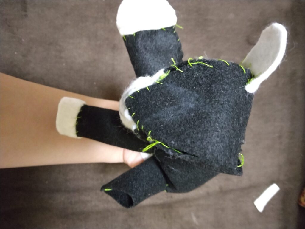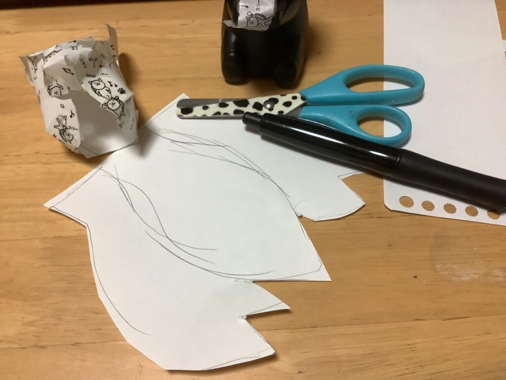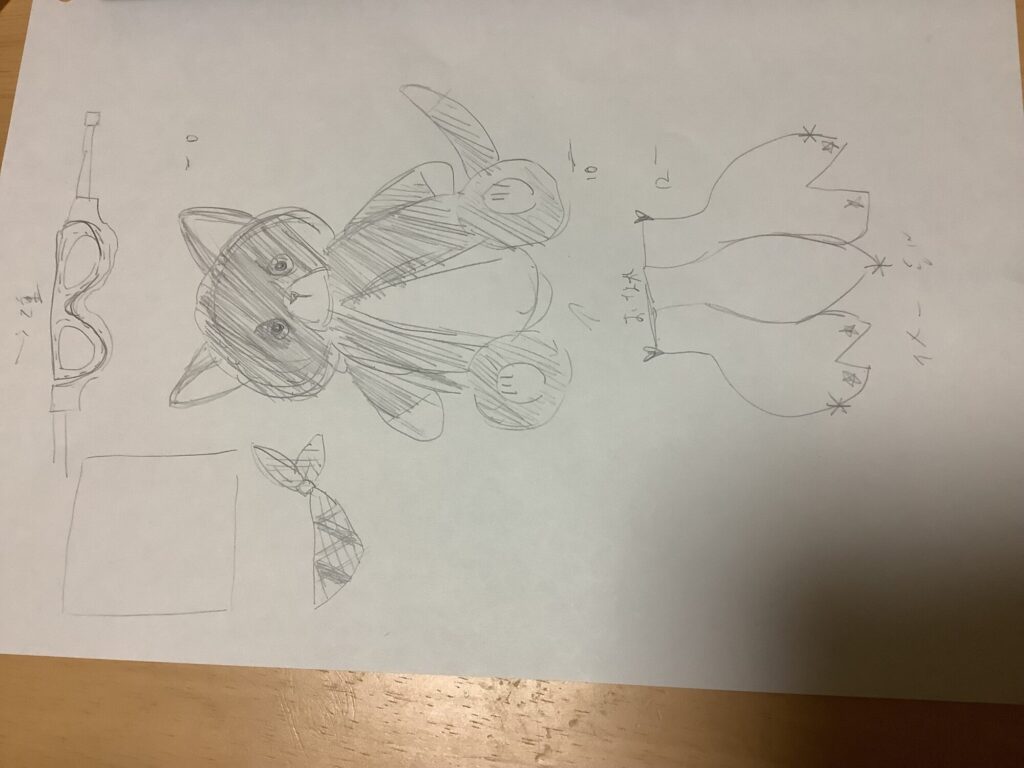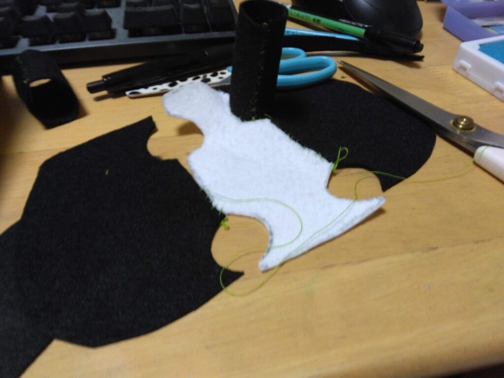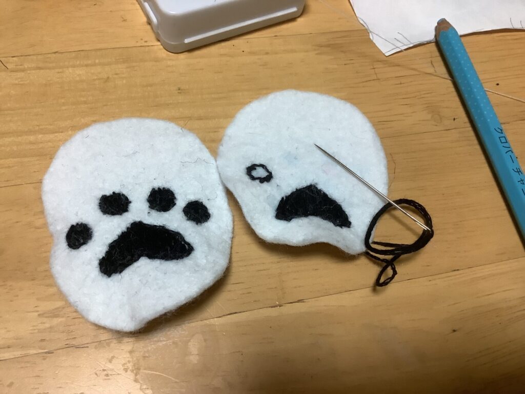 紙とマスキングテープで型紙を作り、フェルトとわかりやすい色の糸で試作を繰り返しました。試作を繰り返すうちに最初の案とは服装もサイズも変わってしまいましたが、可愛く出来上がったのでよかったです❤️