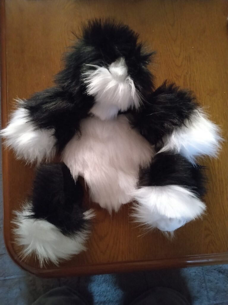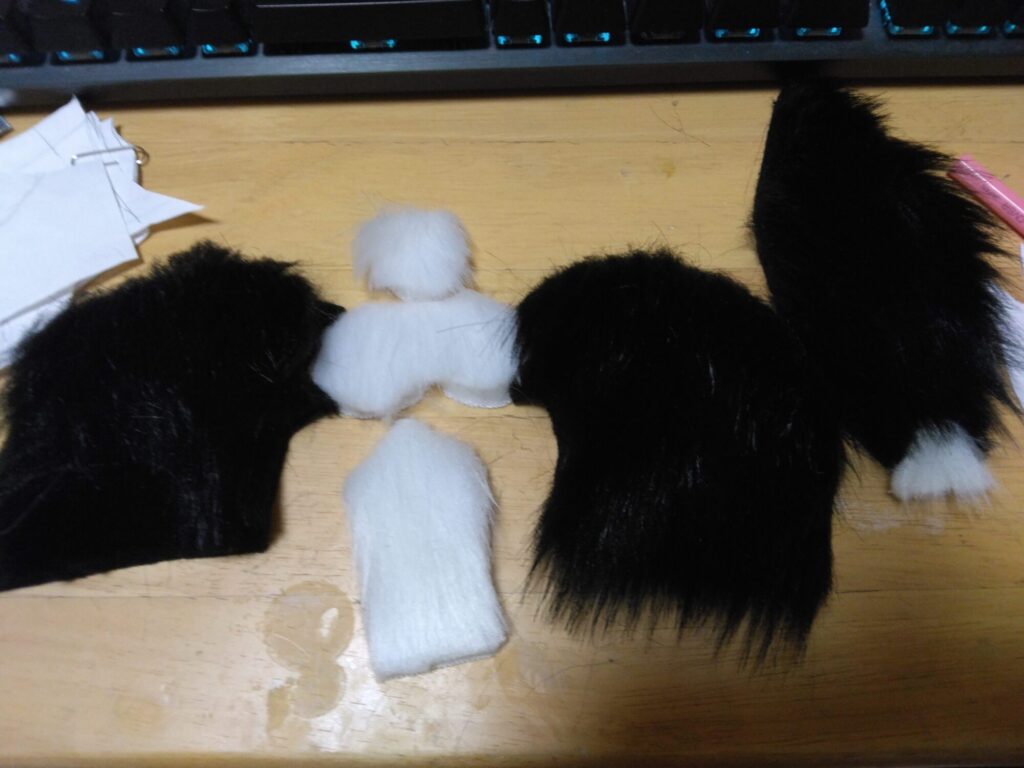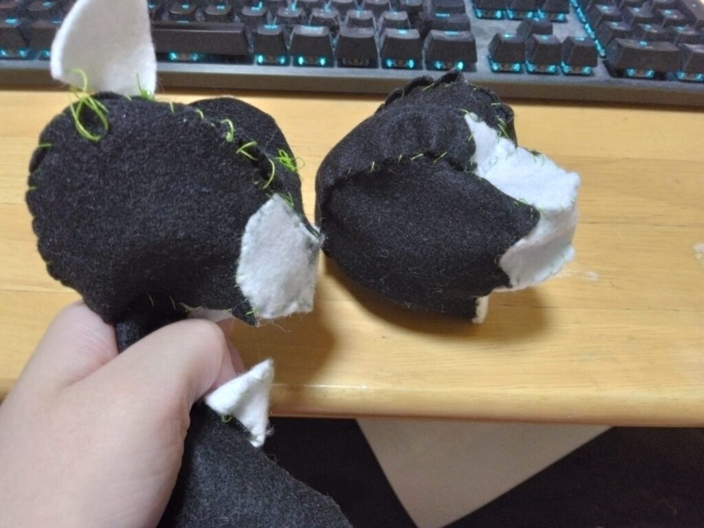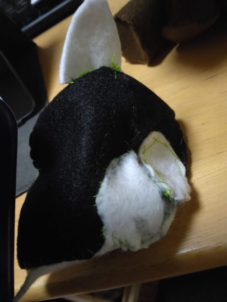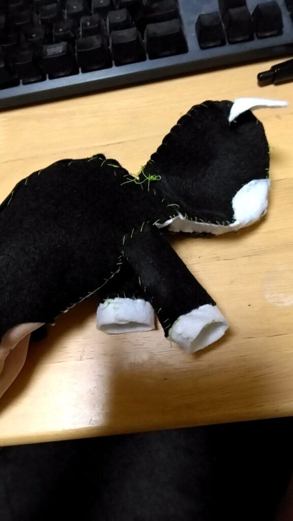 紙とマスキングテープで型紙を作り、フェルトとわかりやすい色の糸で試作を繰り返しました。試作を繰り返すうちに最初の案とは服装もサイズも変わってしまいましたが、可愛く出来上がったのでよかったです❤️