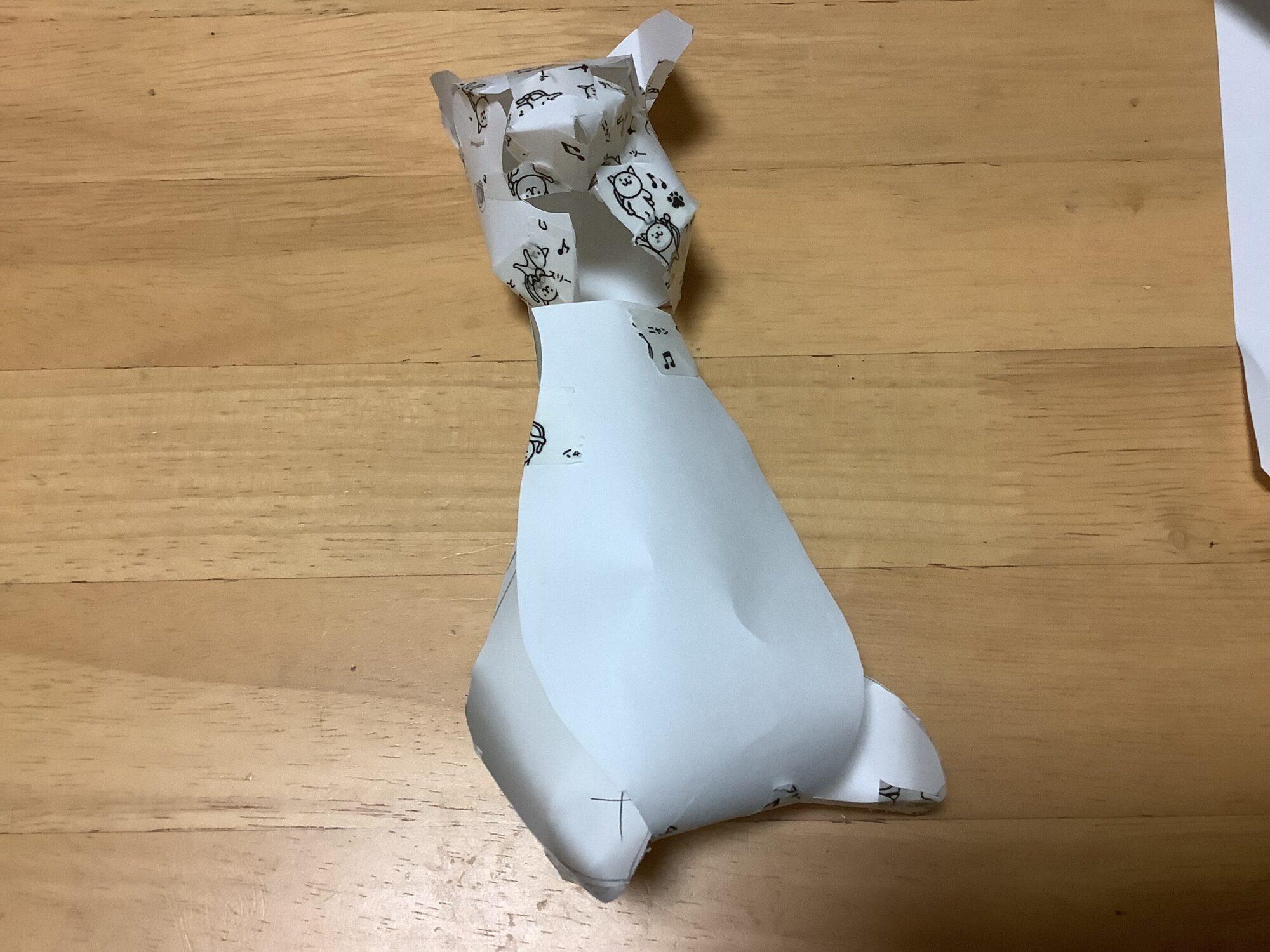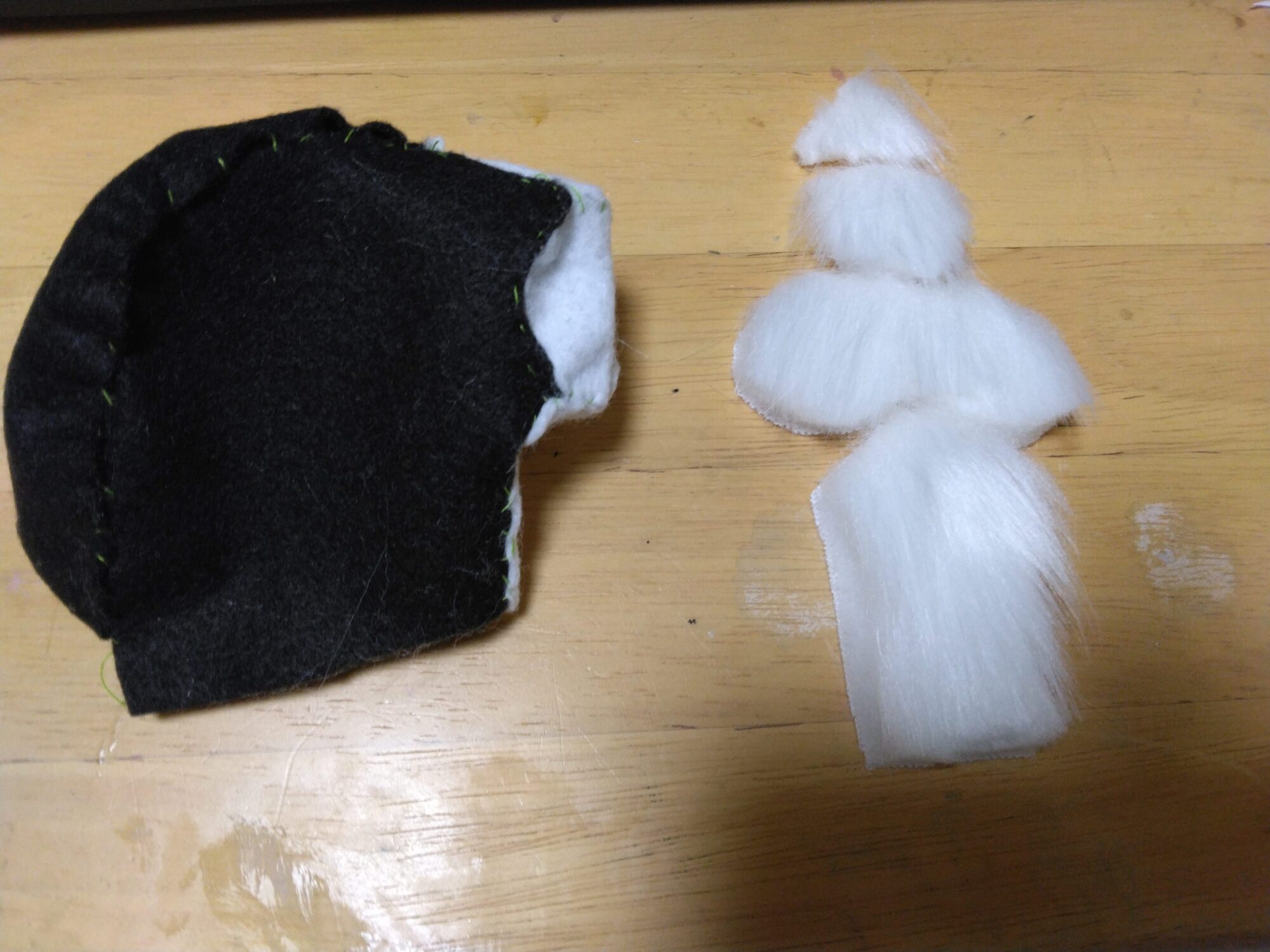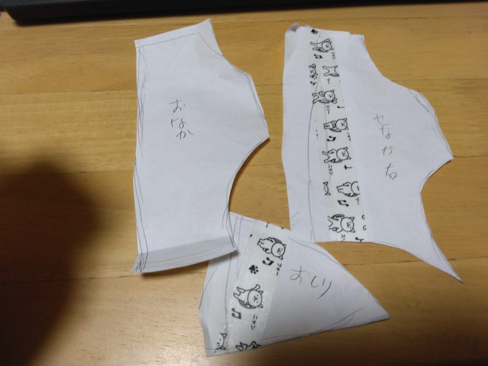 紙とマスキングテープで型紙を作り、フェルトとわかりやすい色の糸で試作を繰り返しました。試作を繰り返すうちに最初の案とは服装もサイズも変わってしまいましたが、可愛く出来上がったのでよかったです❤️