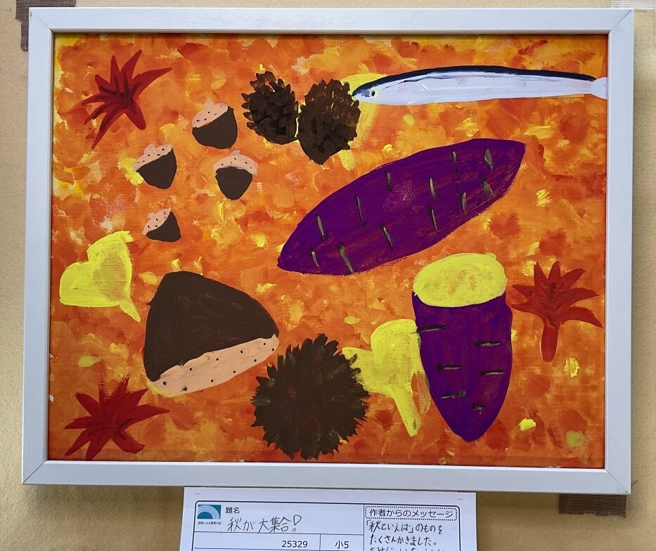 「秋といえば」のものをたくさんかきました。もみじ、いちょうもかいて、明るくしました。