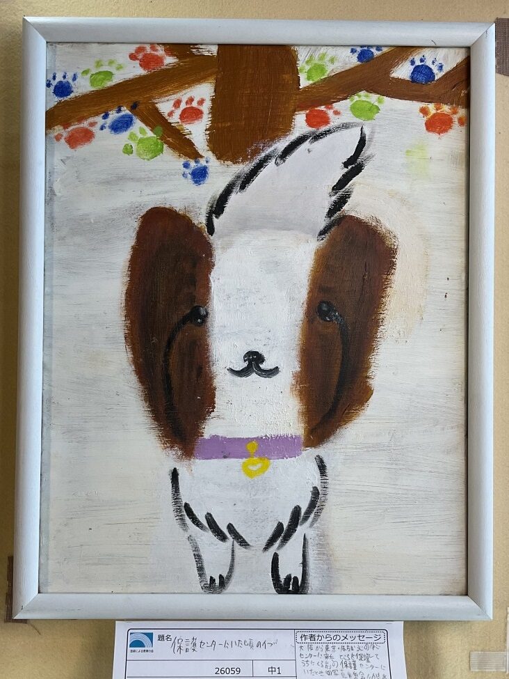 大阪から東京・はちおうじのほごセンターに来たところを保護してうちにくる前の保護センターにいたときの写真を絵にかきました、(犬の名前=イブ)