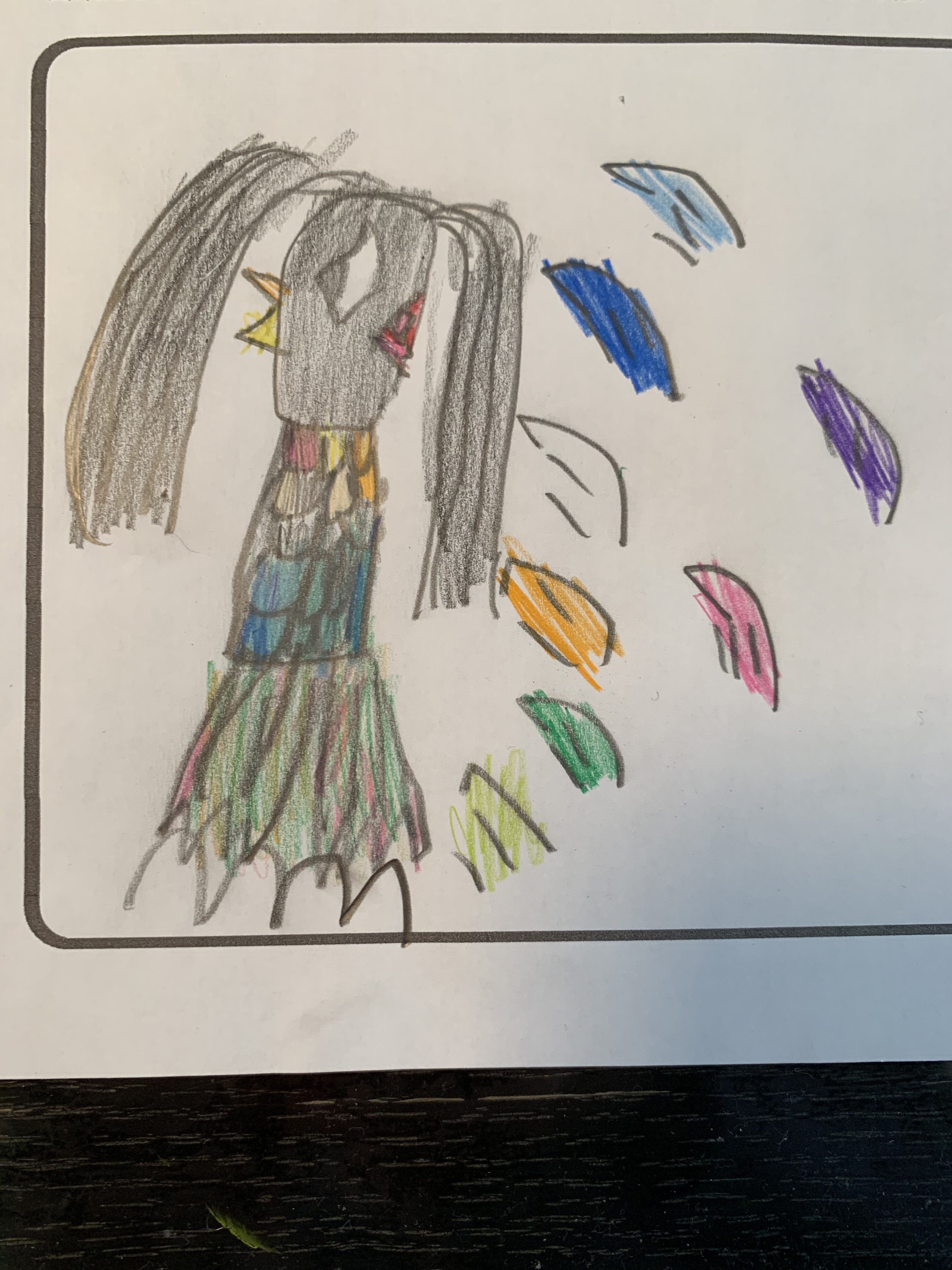 体の部分の色鉛筆の重なりがきれいですね。うしろの波もカラフル!