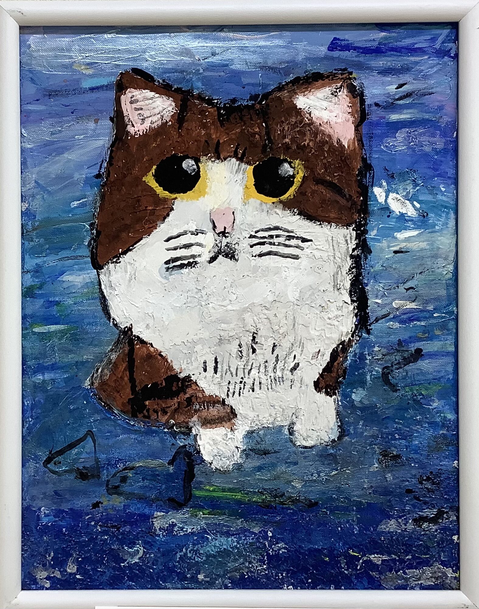 ただ可愛いだけではなくて、こちらをじっと見つめる猫の目に引き込まれます✨普通に筆で塗るだけでは出せない猫の質感や背景の凹凸、色の混ざり方が素敵です!!🥹