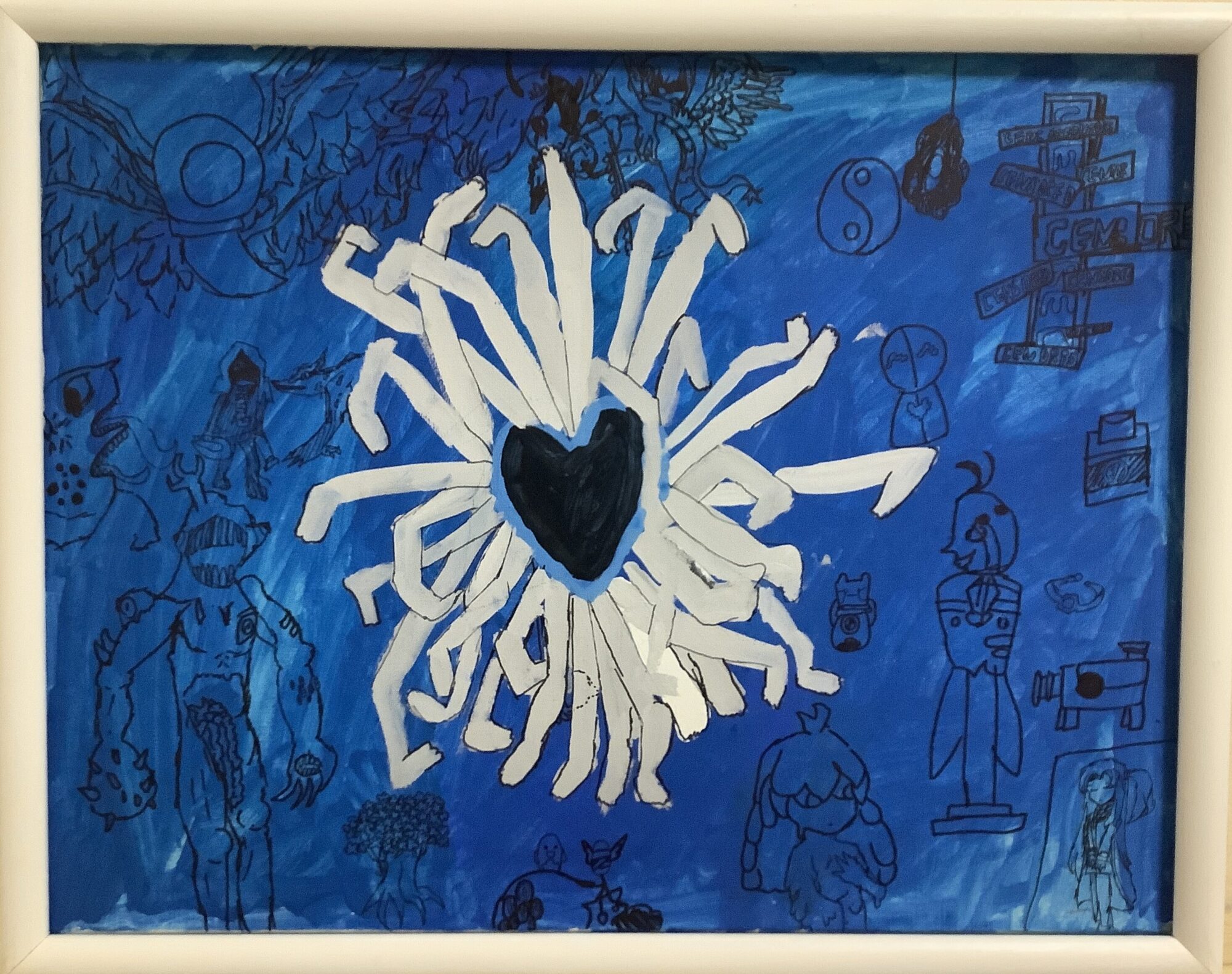 青と黒は明度が近いから、黒で線を描くと消えたように見えるんだけどよく見るとちゃんとはっきり線が見えるのも、トリックみたいで面白いなと思いました。