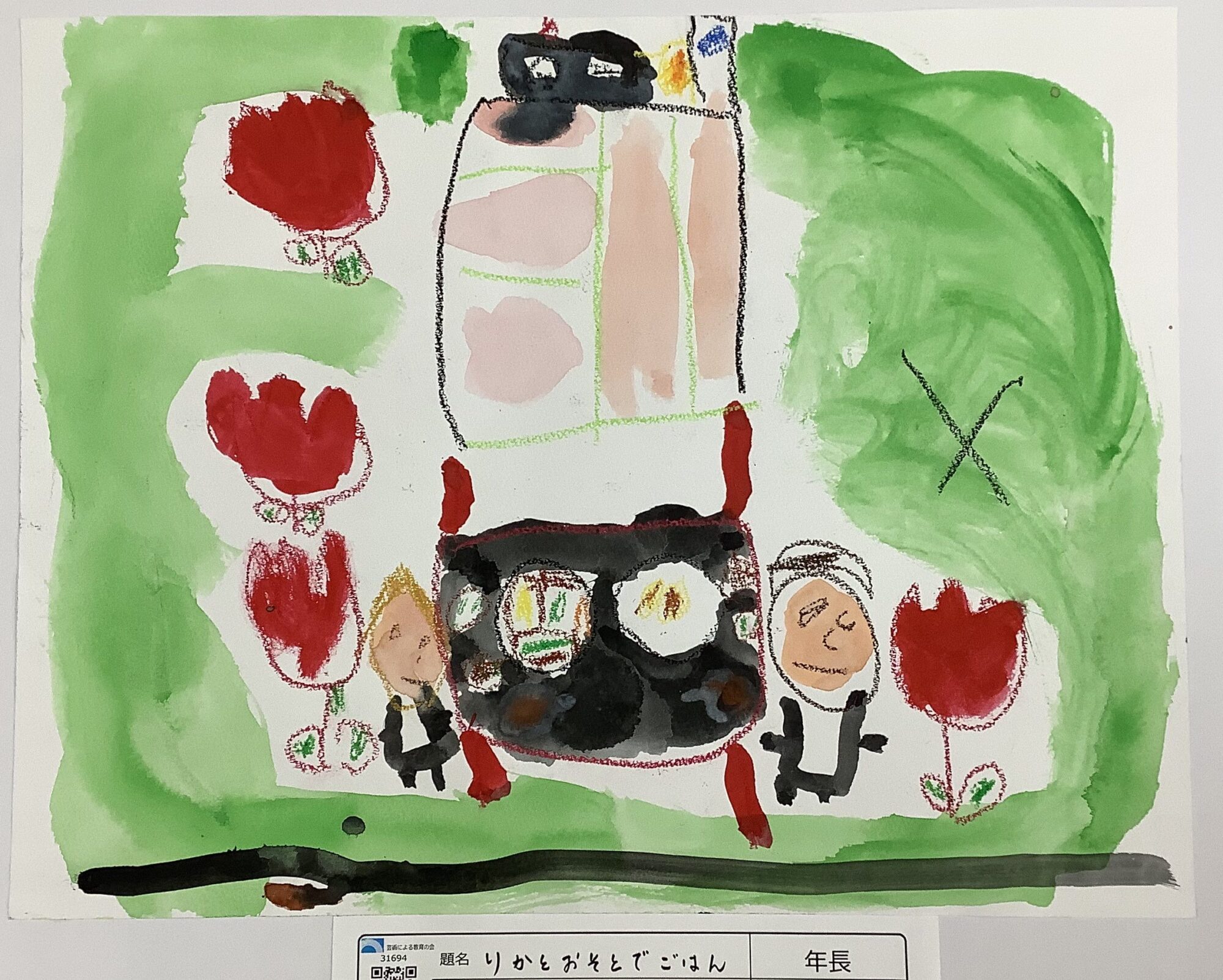 お外で仲良く食べてるところがよく描けてて、とても和やかな気持ちになりました。色合いもきれいで素敵だね‼︎
