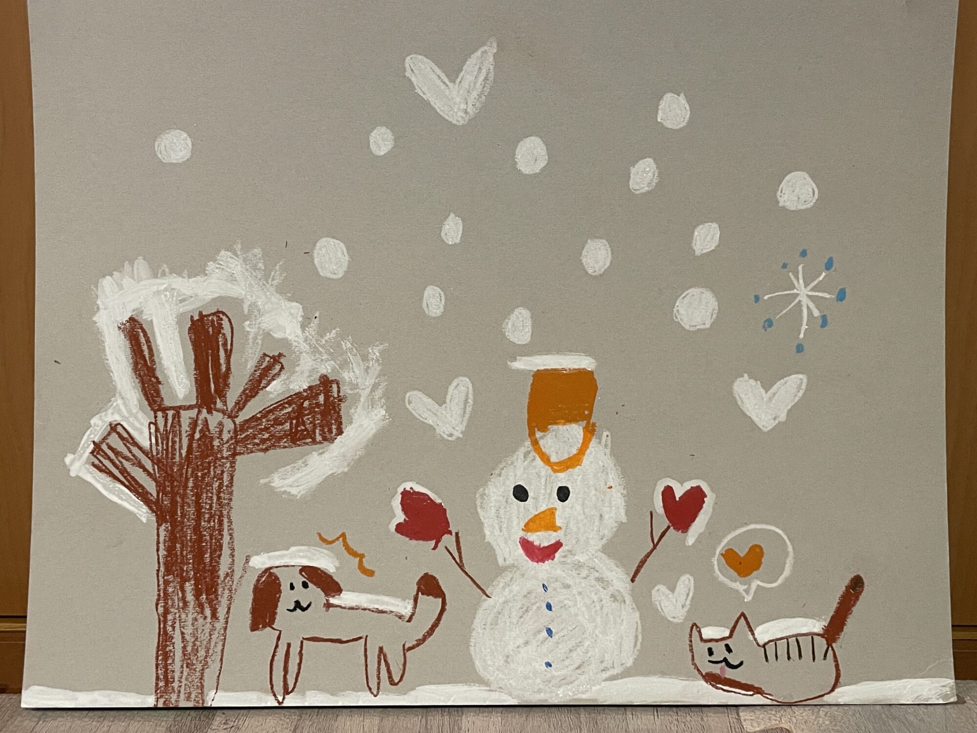 ねこちゃん、雪がみたくて、わんちゃんと雪だるまとお話ししたくて外に出てきたのかな?でも寒いからこたつで丸くなるポーズをしているのかも?👀