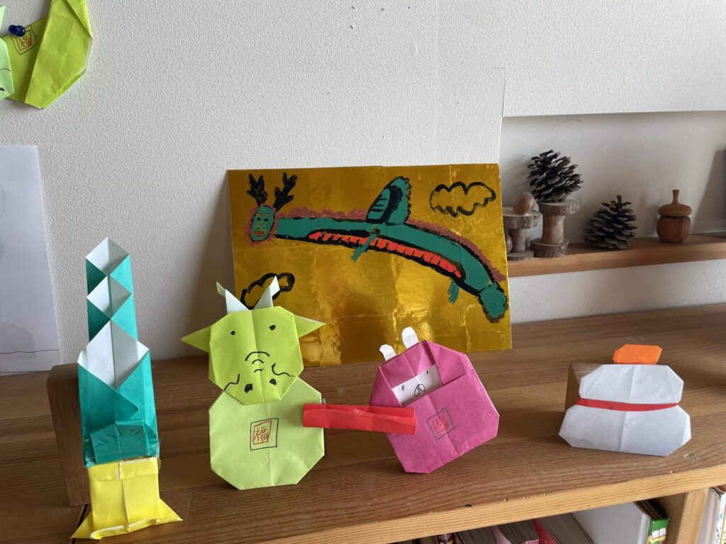 年末に思いのままに描いた龍を生かして黄金の絵にしました。金箔を貼るのも、龍を描くのも、とても楽しかったようで、アクリル絵の具と油性ペンを使い分けながら、丁寧に一生懸命仕上げあました。年末に兄弟で作ったお正月の折り紙飾りの中に飾りました!