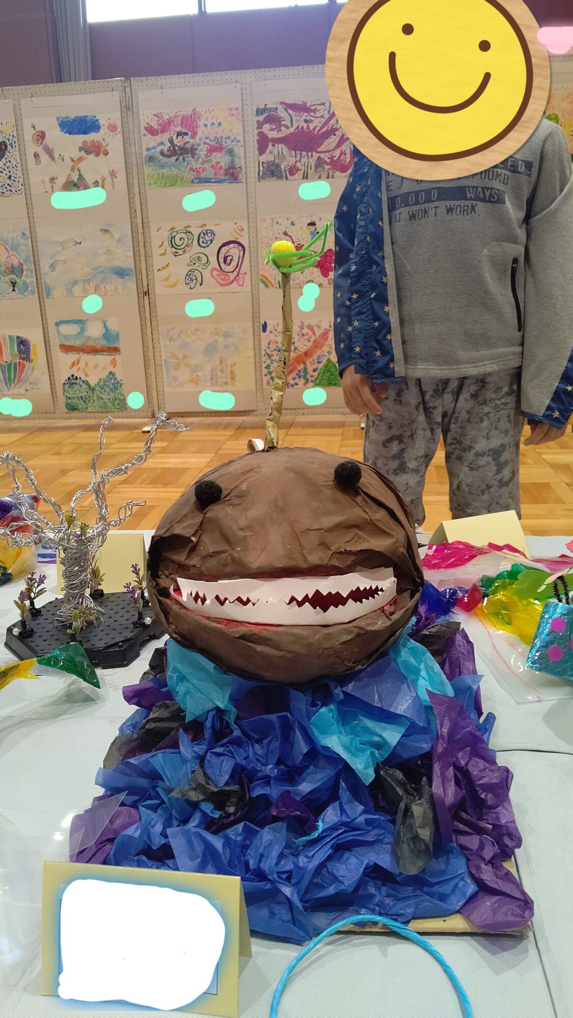 張子みたいな感じで制作したようですが、土台は段ボールに深海を表現するために暗めのお花紙をくしゃくしゃにしたみたいです‼️