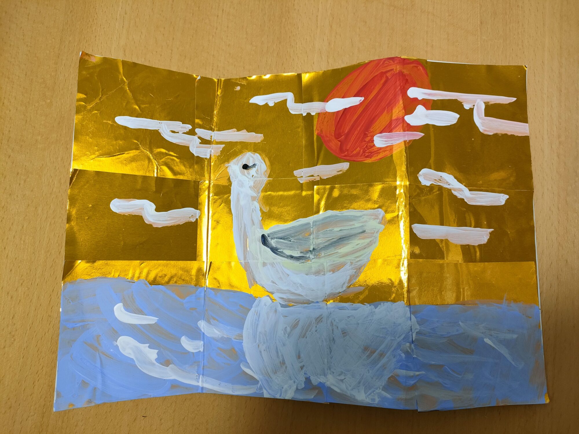 白が沢山使われている絵ですが、雲の白と、白鳥の白と、水面に映っている白が全部違う色になっているのが、こだわりを持って制作したのが伝わってきて良いなと思いました⬜