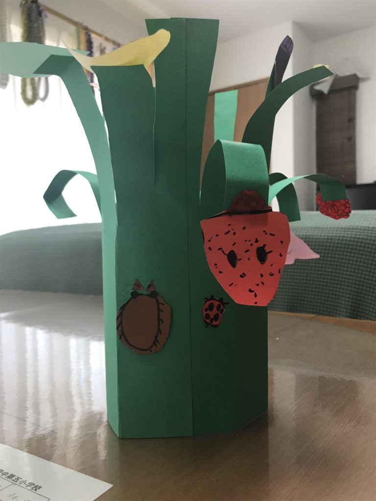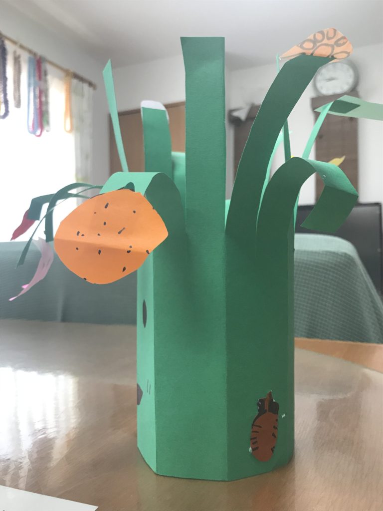 緑の画用紙を丸めてノリで貼るのが難しかったです。
