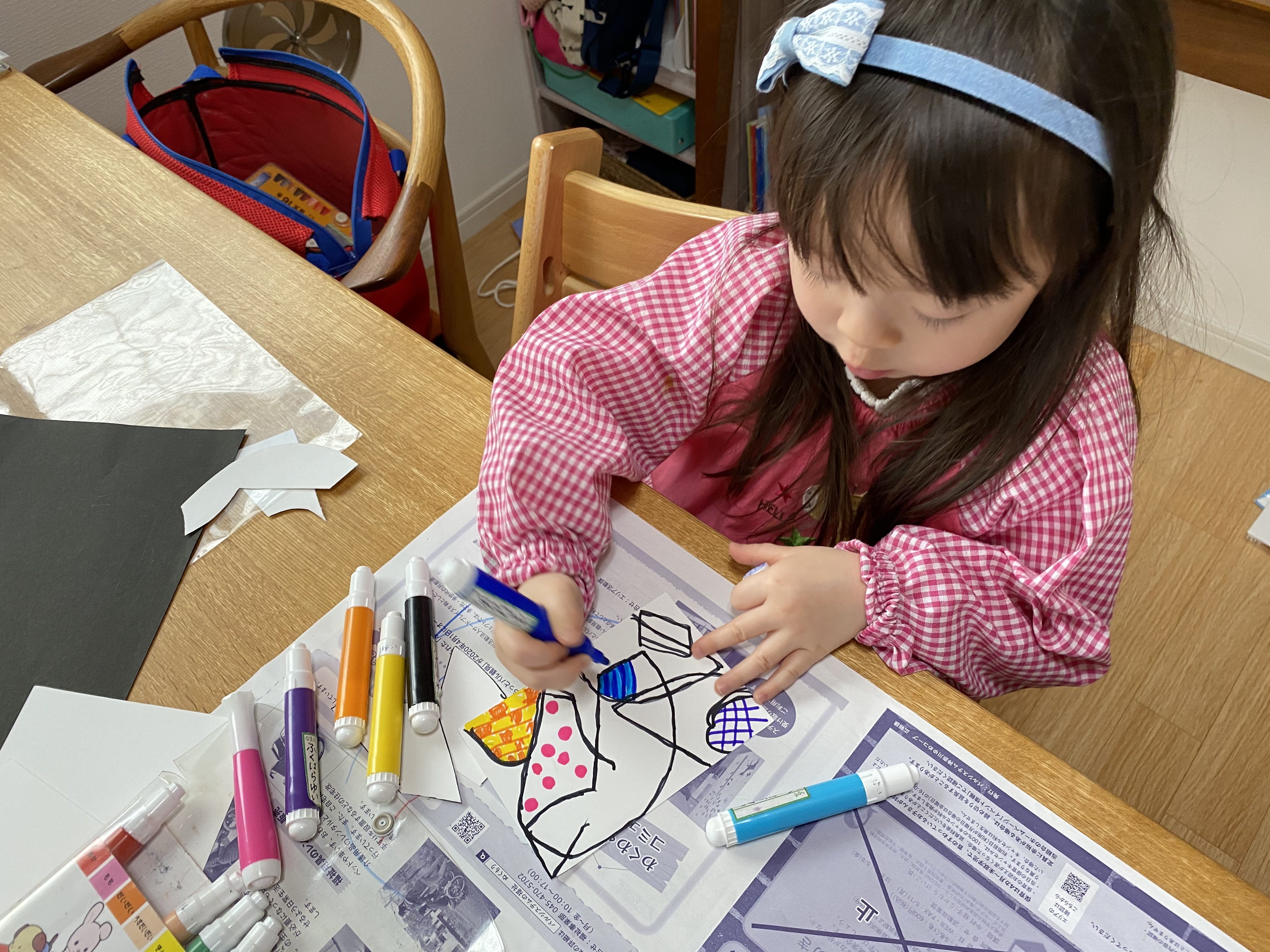 通常美術のレッスンでは教室でお迎えの時に見るので作る過程を見られませんが、すごい速さで仕上げていってすごいなぁと感心してしまいます。