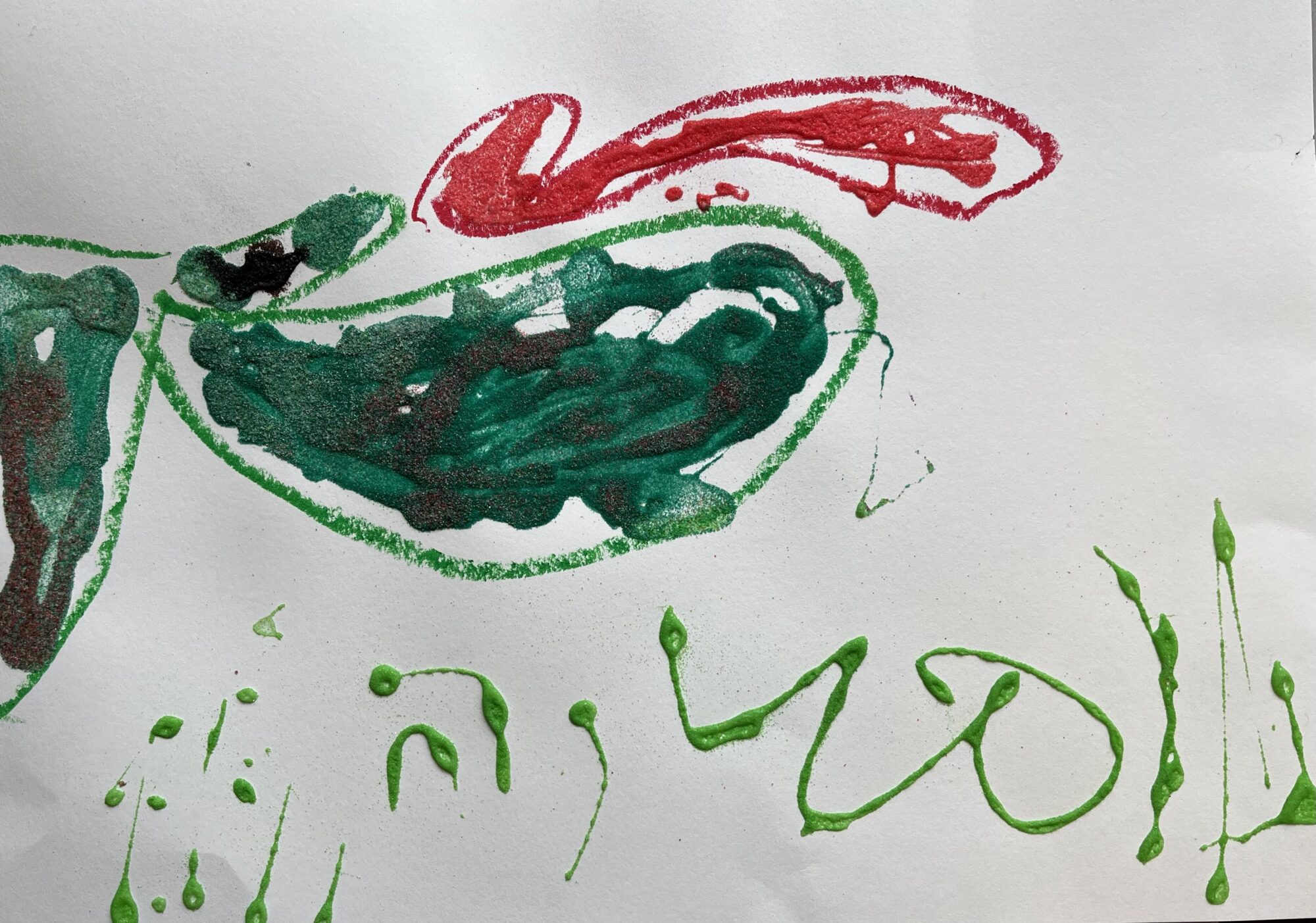 クレヨンで描いた後、糊をつけて色砂をかけました。