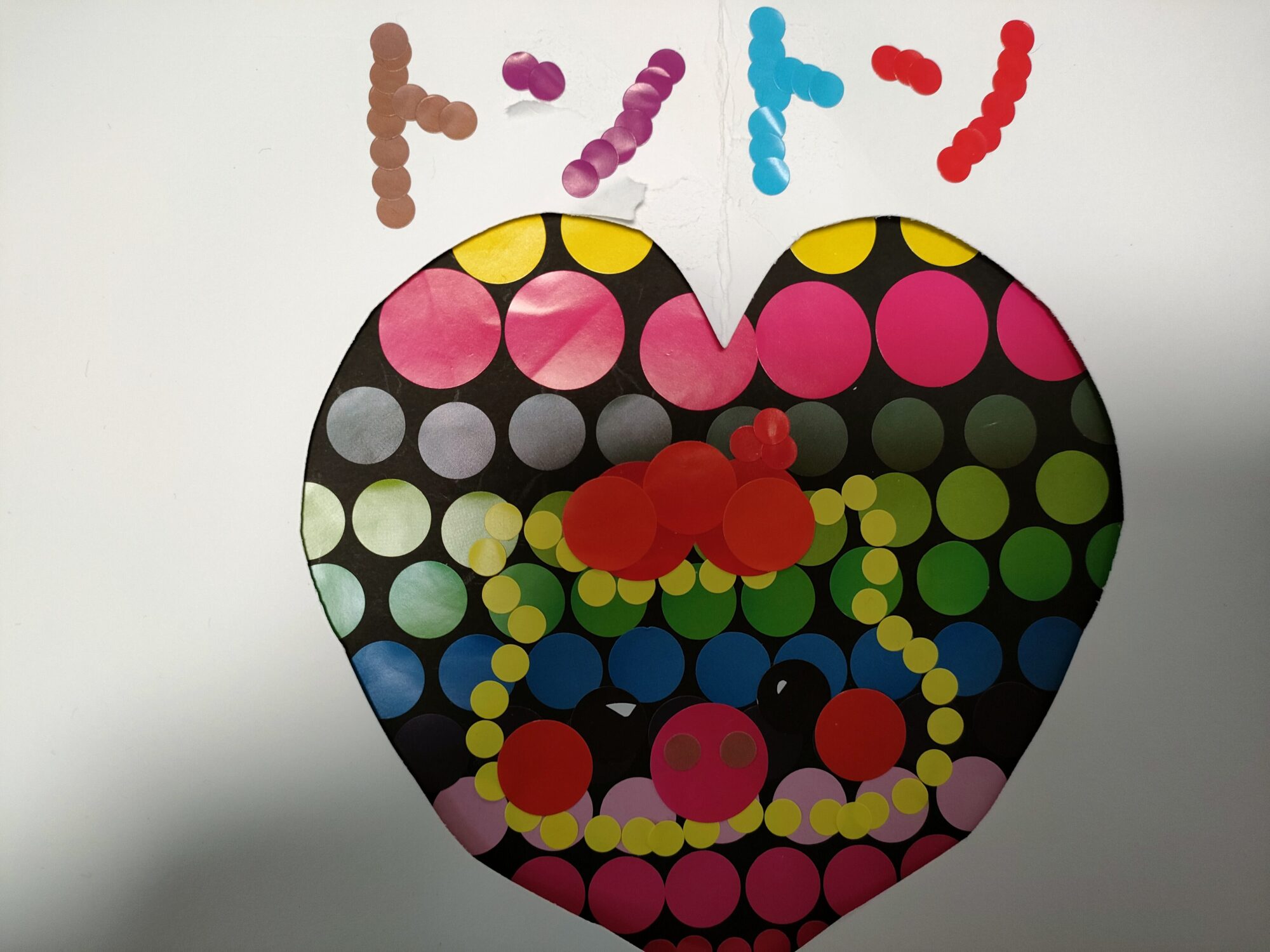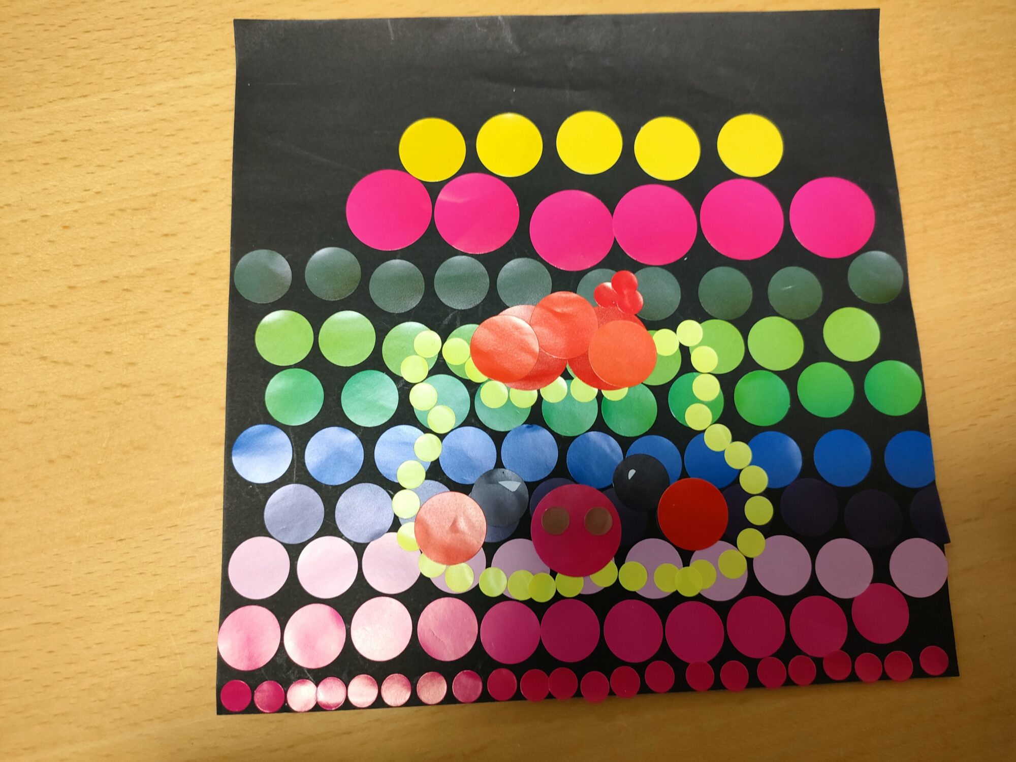 にじいろの背景にトントンくんがいる!まるシールの大きさや色を考えながら組み合わせて作れるってすごい!