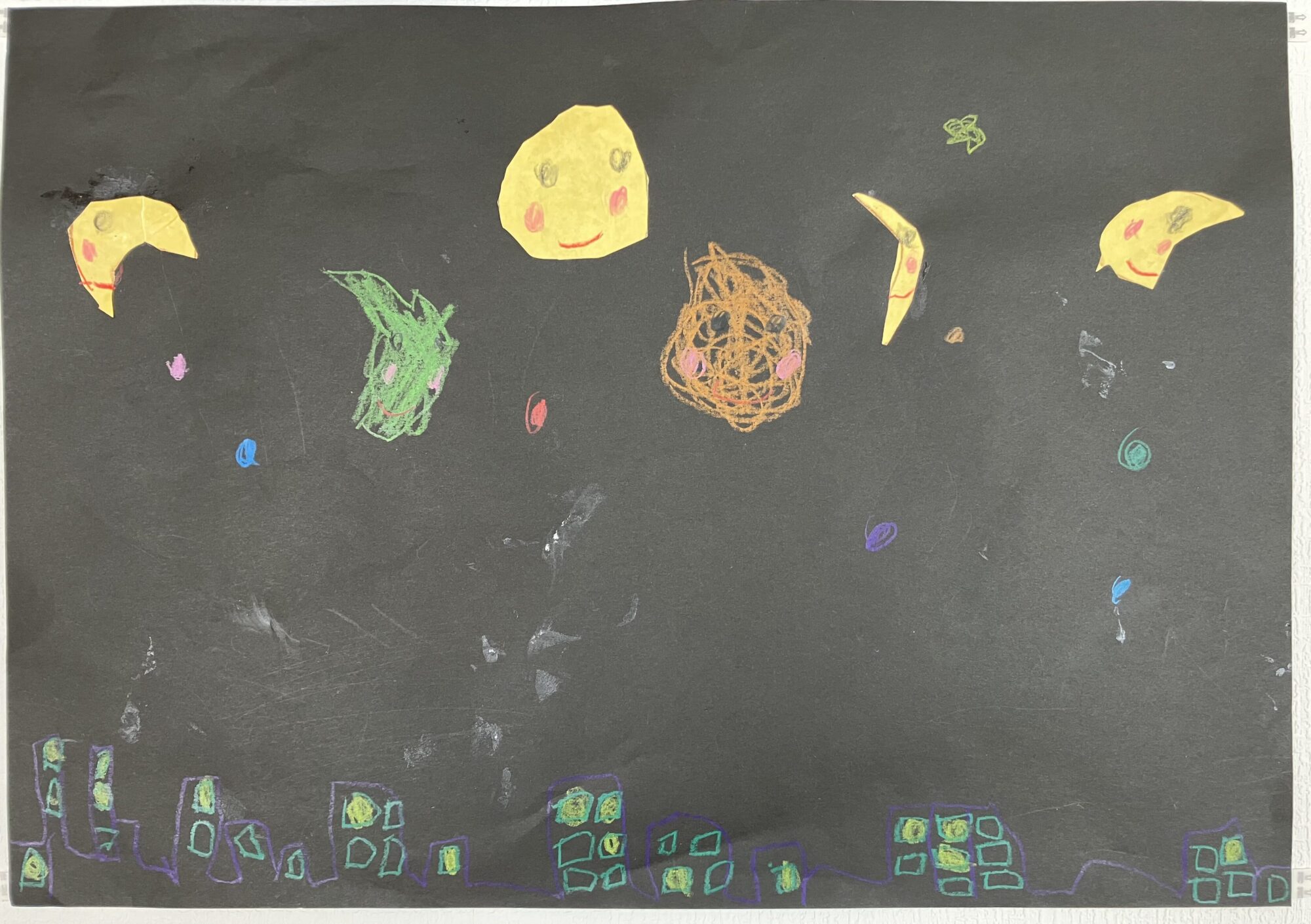 いろいろなお月さまに色とりどりの星、街には灯りのついている窓や消えている窓があるそうです。