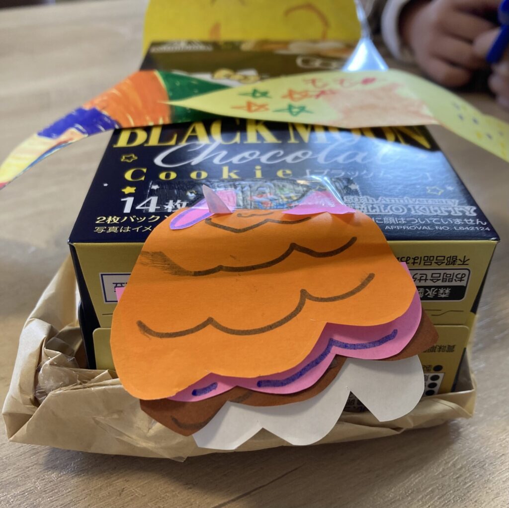 このレッスン後、残ったクラフト紙を丸めて色を塗り、りんごを作ってあげていました。