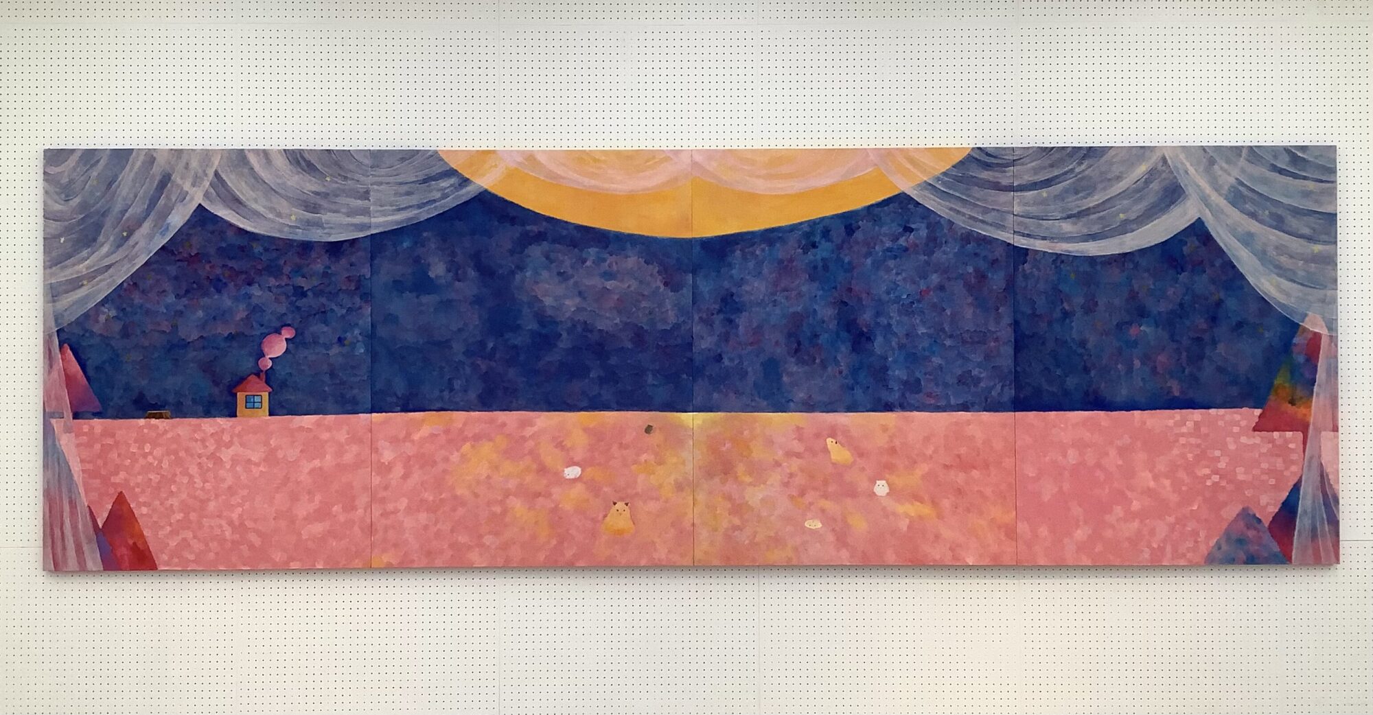 暗い夜でも、月明かりに照らされてみんなで過ごす夜は、きっと暖かくて穏やかな時間で、静かでも孤独を感じることはないと考えている。かつて飼育していたハムスターには穏やかな気持ちでいて欲しいこと、また、私自身が絵やハムスター、 風景に癒しを求めていることが、今回の作品を制作した動機である。