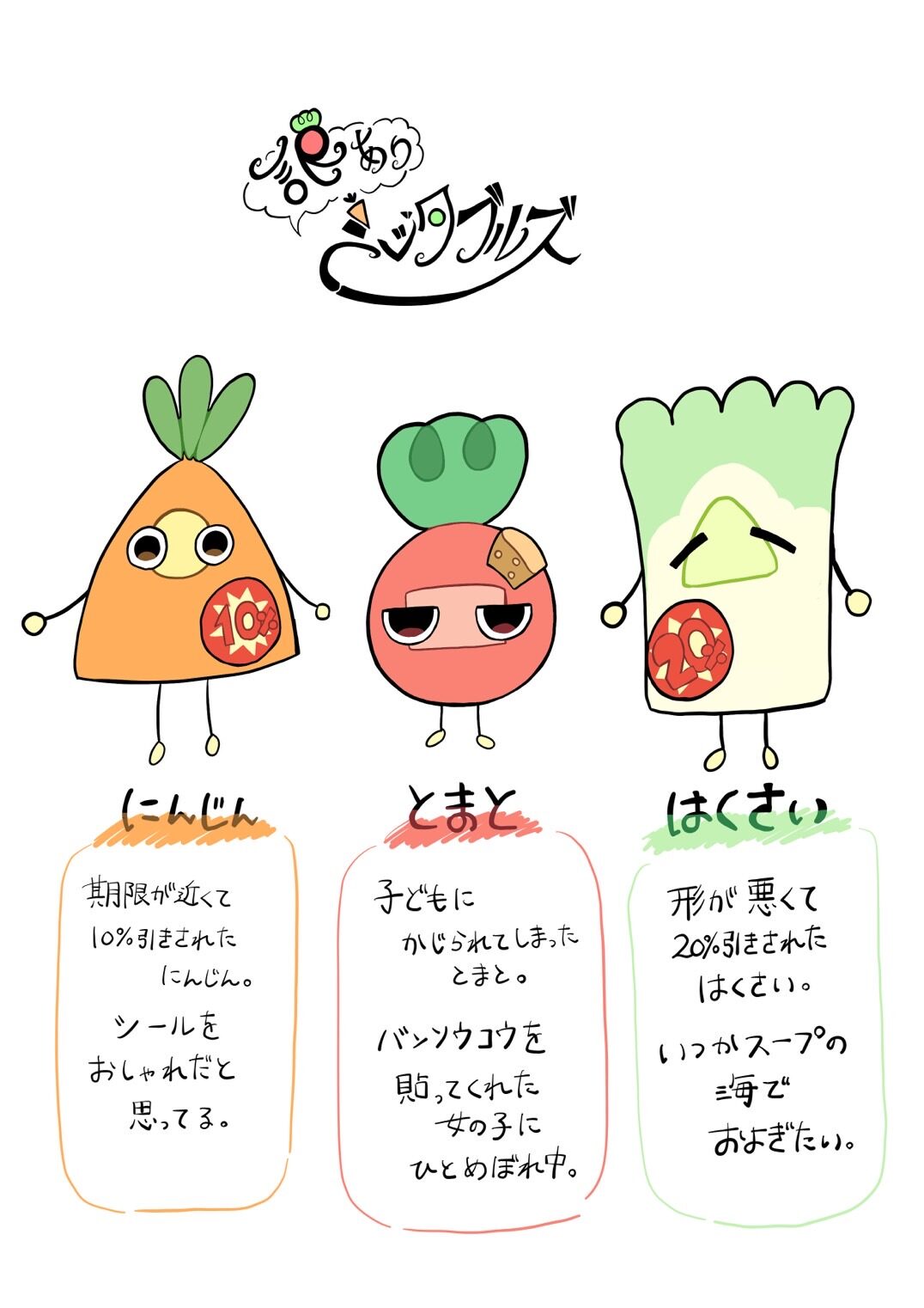 いつも絵元気な、にんじん🥕 ちょっとツンデレな、トマト🍅 ニコニコおおらかな、はくさい