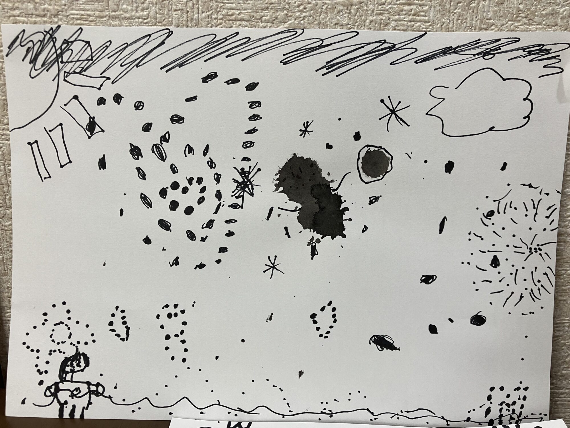 垂れた墨汁を雪に見立てて、周りには空や花火を描きました。