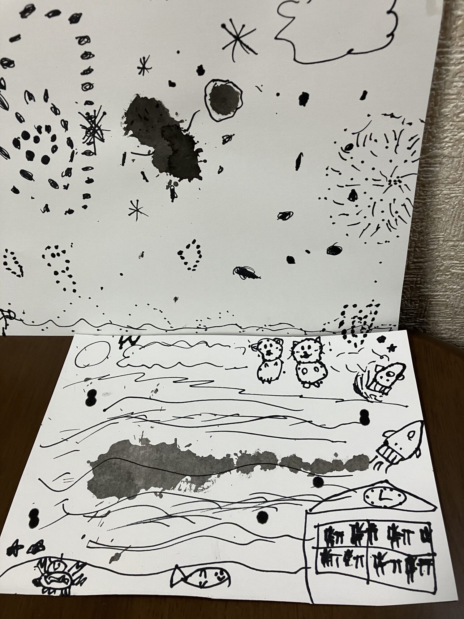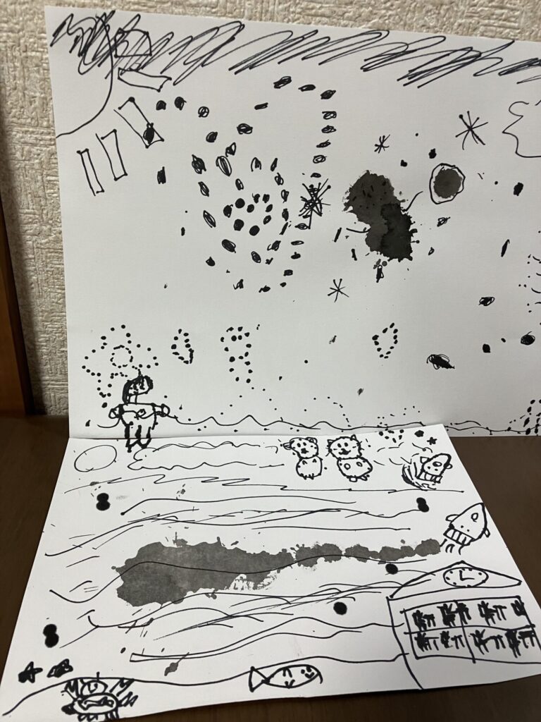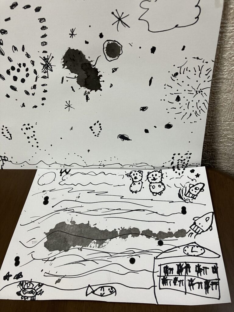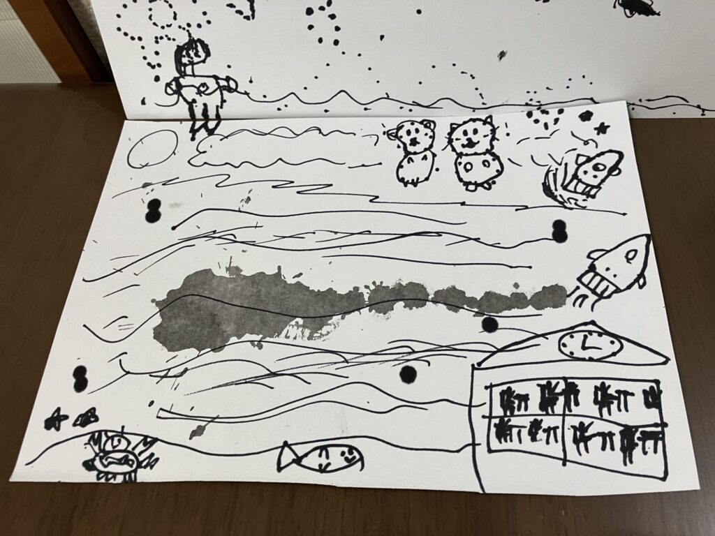 もう一枚の絵は、垂れた墨汁をロケットの煙に見立てました。周りには夜の学校や海の生き物など、思い浮かんだものをどんどん描きました。