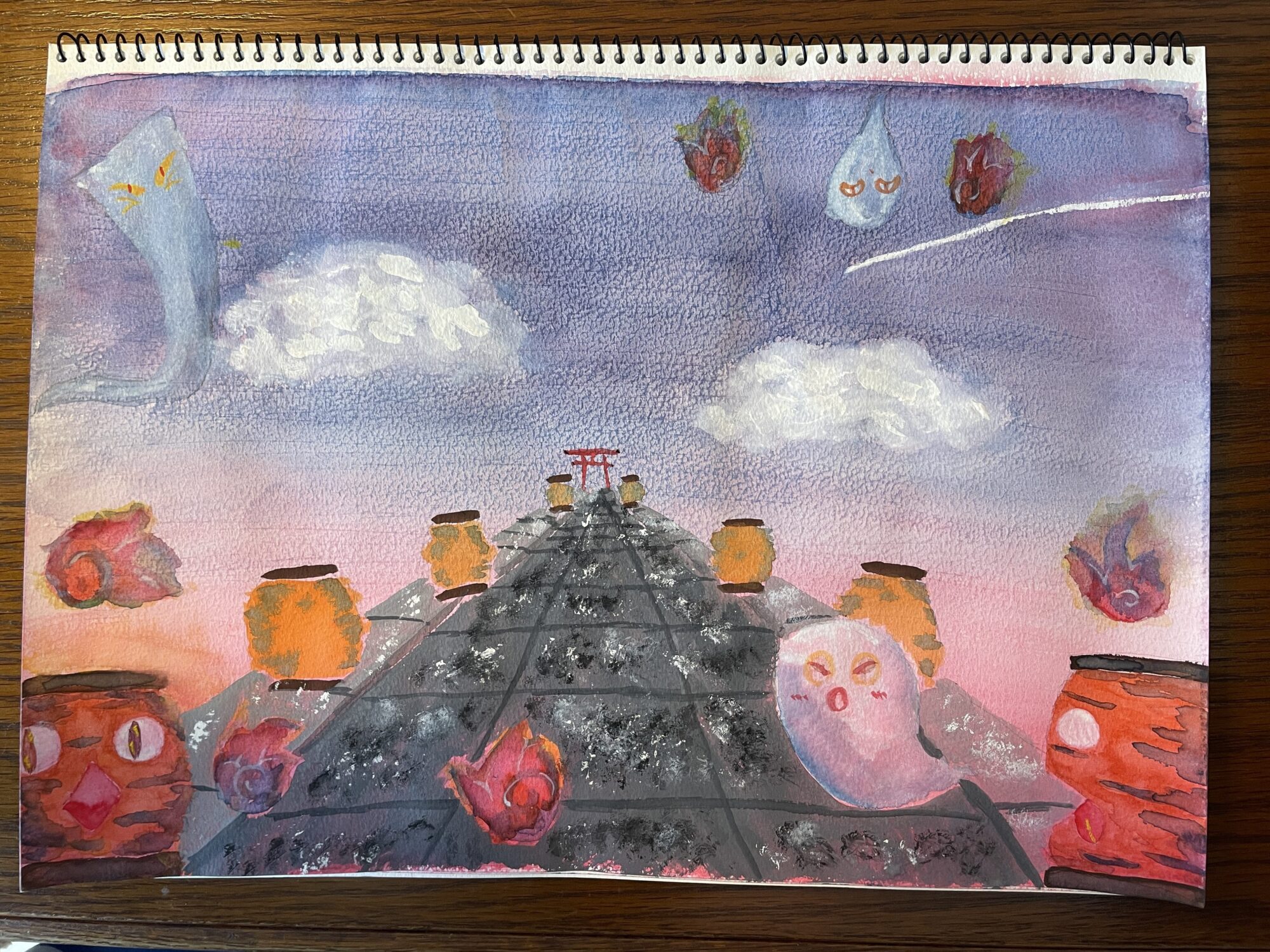 遠近法やグラデーション、雲の描き方など絵画コースで習ったことが集約されていて、さらに小夏さんのアイディア満載の作品になっていて素敵な作品だなと思います。