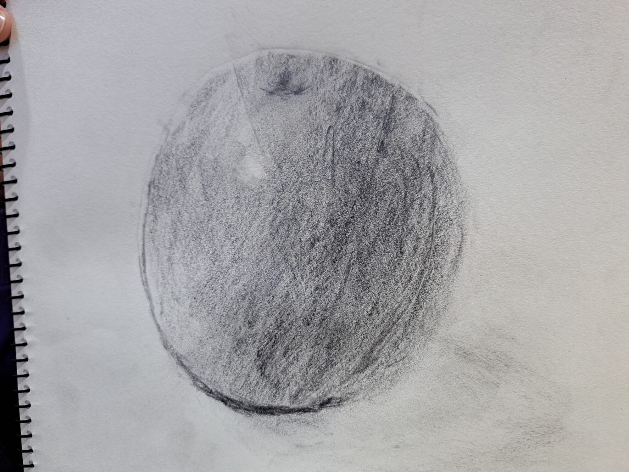 りんごと床がくっついている一番暗いところ、上の方のつやっと光っているところもバッチリ👍 特にりんごの右側、りんかくを線無しで表現できていて、まるで紙から浮き上がってくるように描けていますよ😲!難しい課題によくチャレンジできました👏👏これからの作品も楽しみにしています💓
