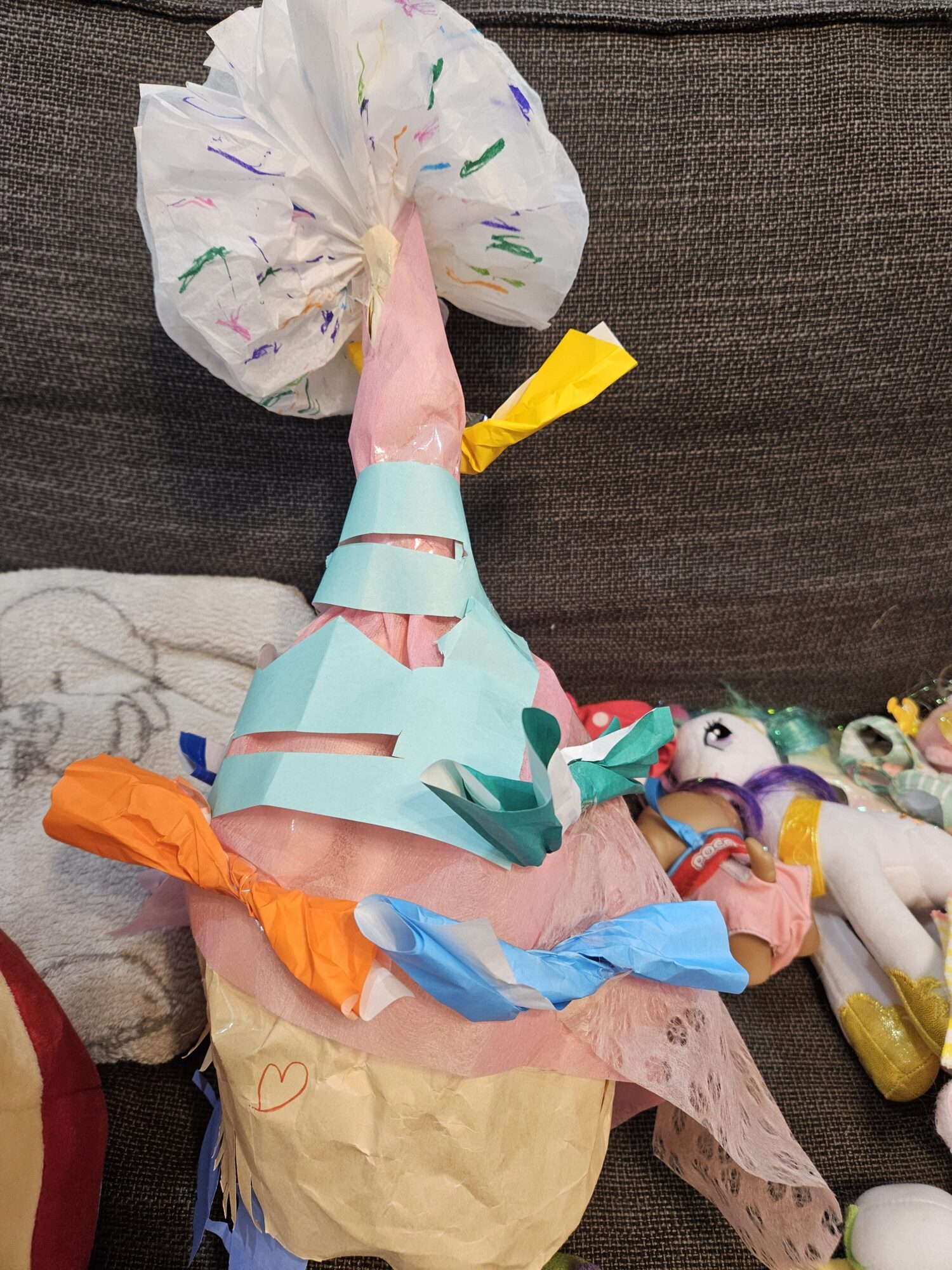 ピンクの紙を巻き付けたのとてっぺんにお花をつけて水色のサングラスをつけたのがポイントです!