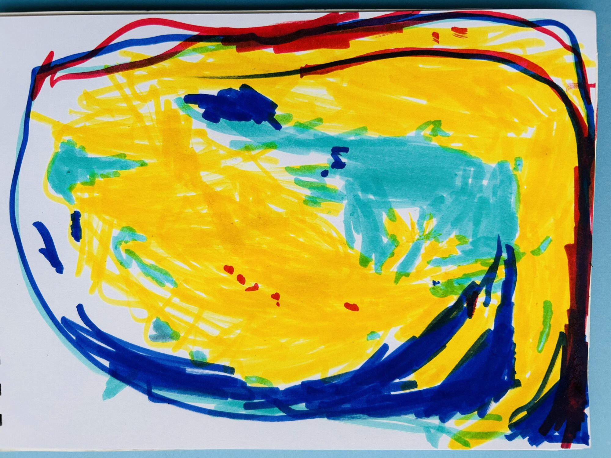 プールにプカプカ浮かんでいるところでしょうか、日向ぼっこをしている最中でしょうか。抽象度が高い作品ですが、何故か癒やされているというイメージが伝わるのが、この絵のすごいところだと思いました🤔