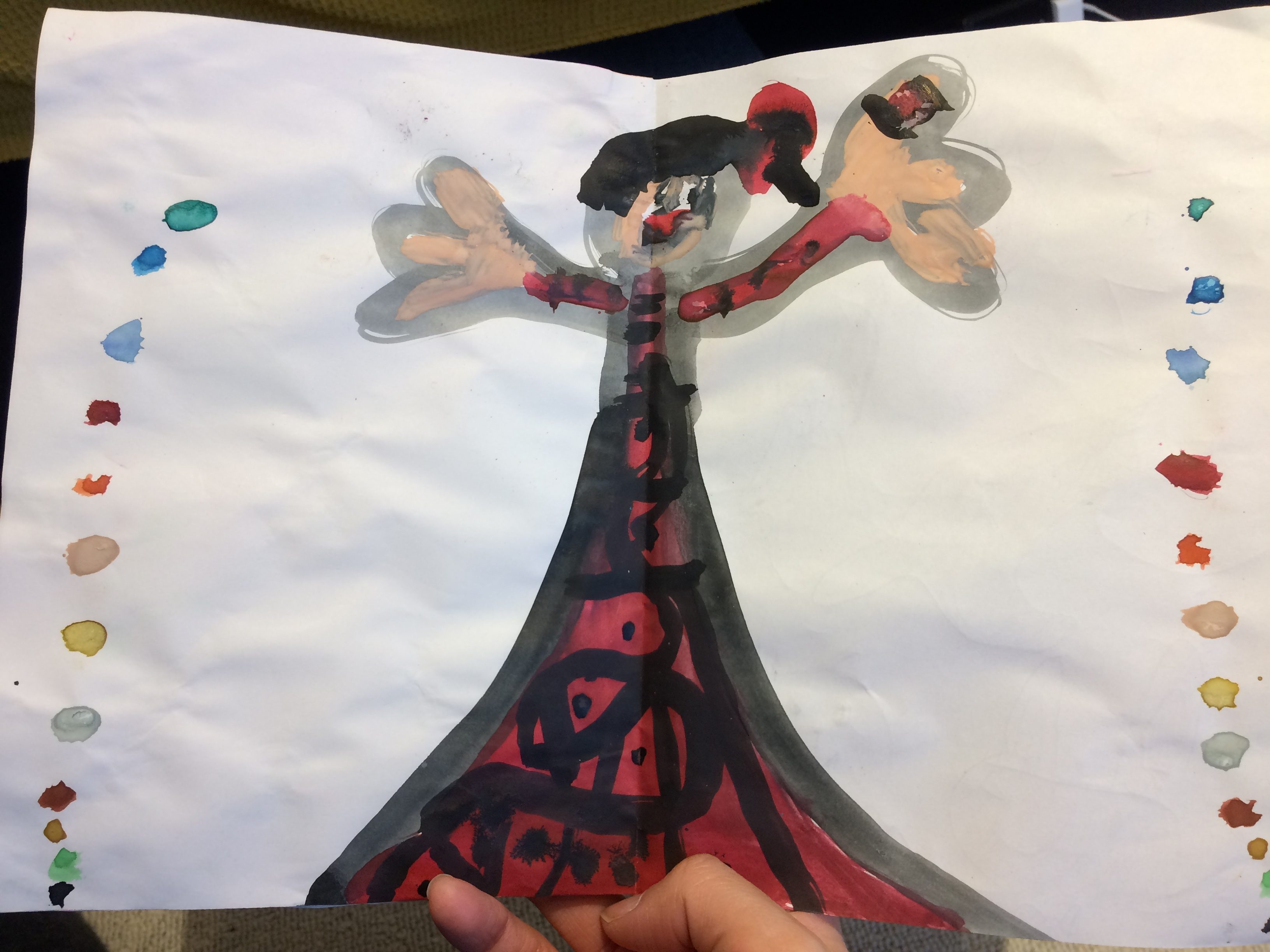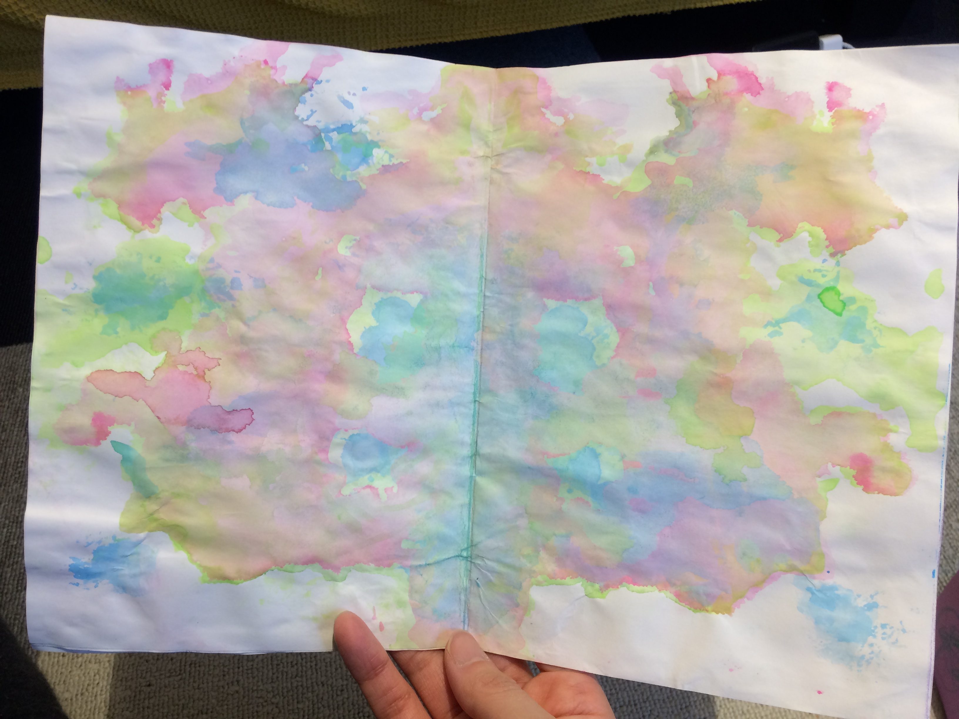 絵の具のデカルコマニーを楽しみ、次の発想画にすすむ流れでしたが、