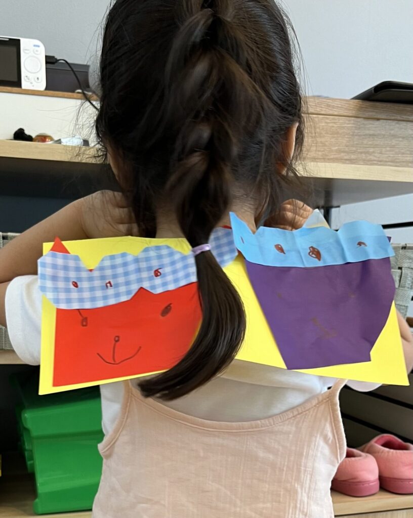 まえには猫とうさぎがいます。肩に大きなリボンをこだわってつけていました。