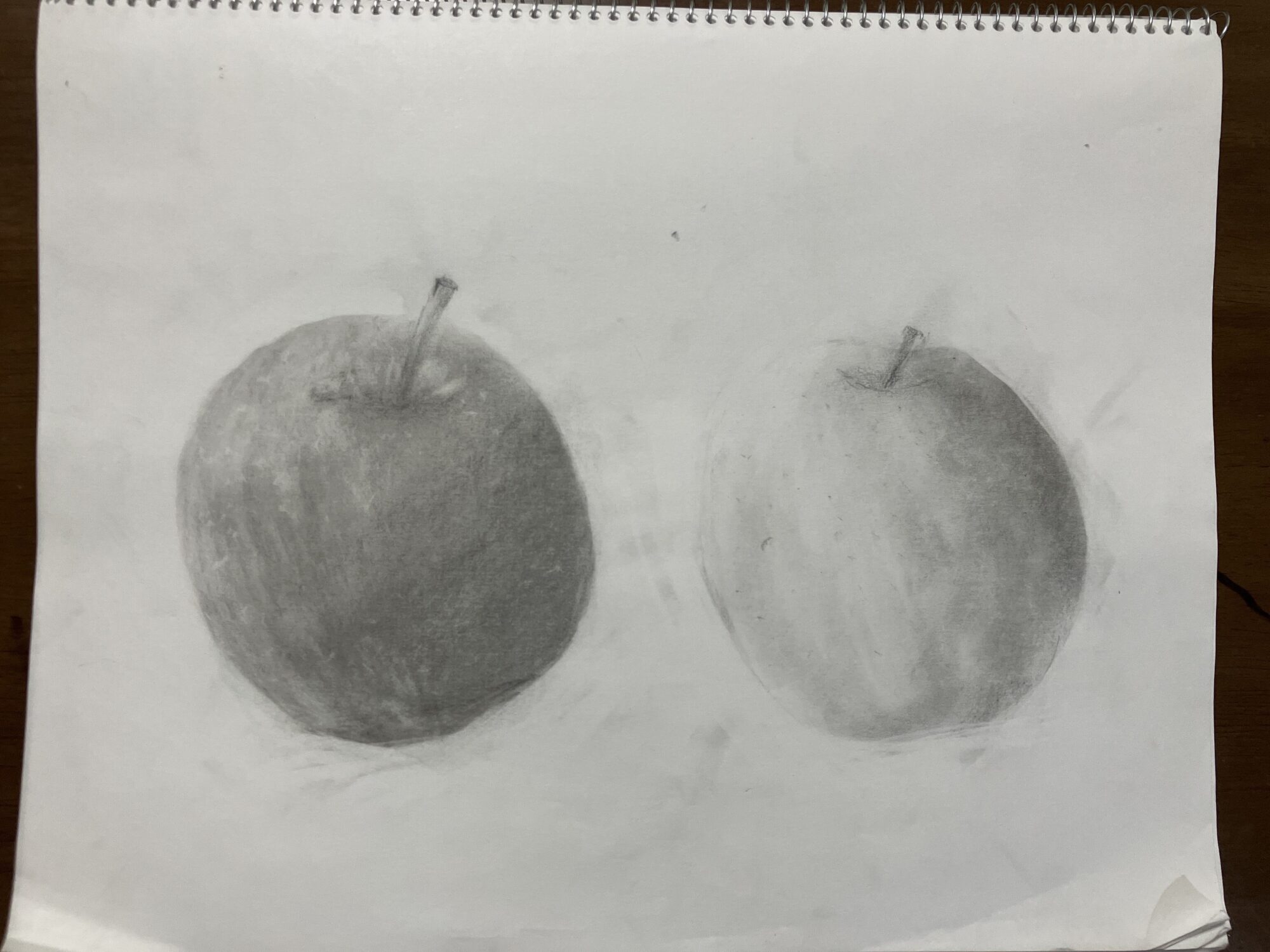 めっちゃかっこいいりんごだあ~!!黒っぽいリンゴも、白っぽいリンゴも影のつけかた、グラデーションがでていて、いまにも触れそうなりんごに描けてるね!!すごいなあ~!練りケシで、微妙な加減を出しているね~