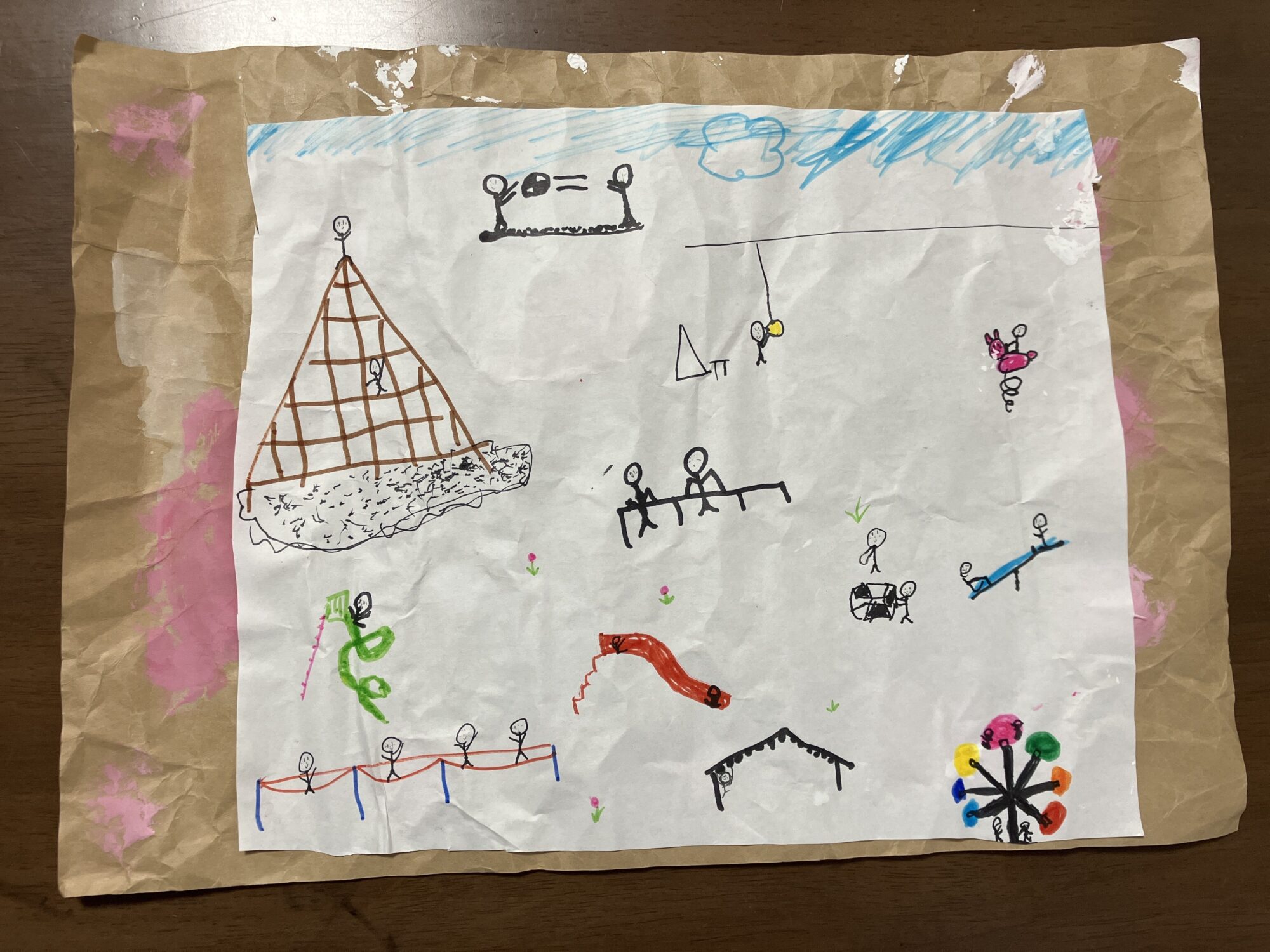 ちょっとづつ、丁寧に遊具やまわりの花壇、ボール遊びなど描いていっていたよね。