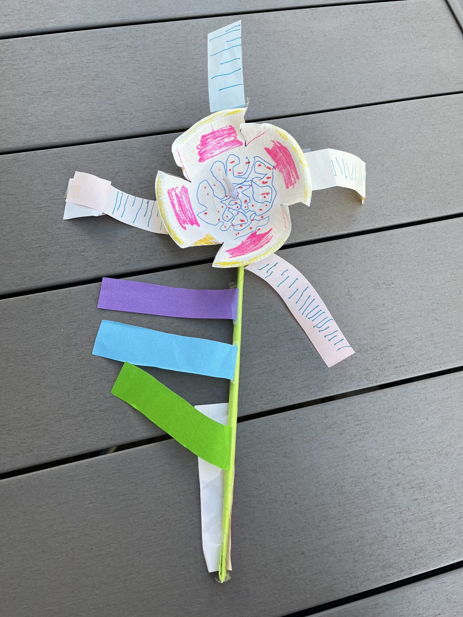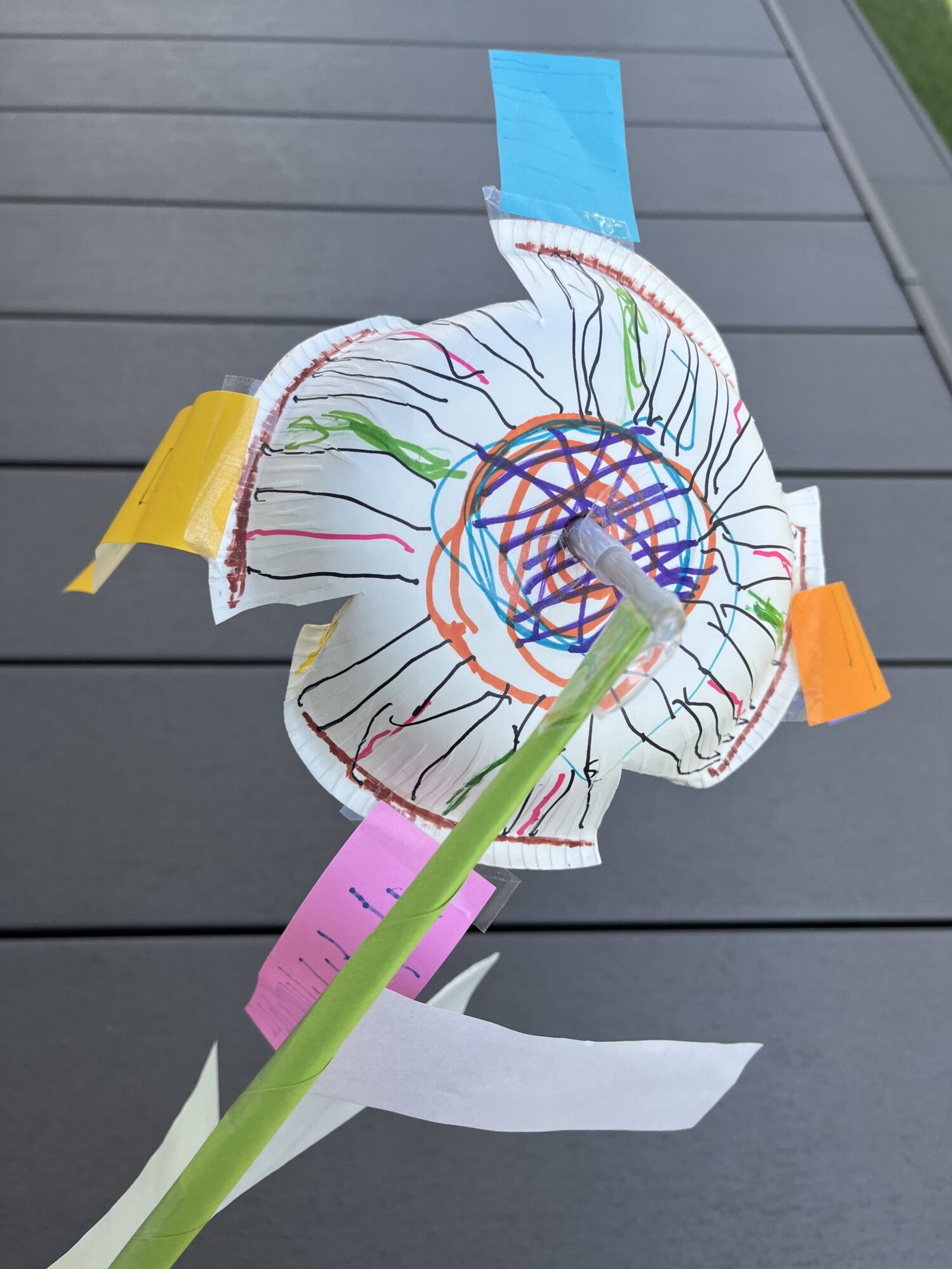 こんにちは~!!とってもカラフルで、おりがみの羽などつけて、くふうしてつくったね!!自分でひとりでやった感じがみてとれるよ!頑張ったね!!回らなかったら、羽をはずしたり、いろいろ考えてチャレンジしてすごいなあ!!これからも、チャレンジする気持ちをわすれずたのしんでね!!
