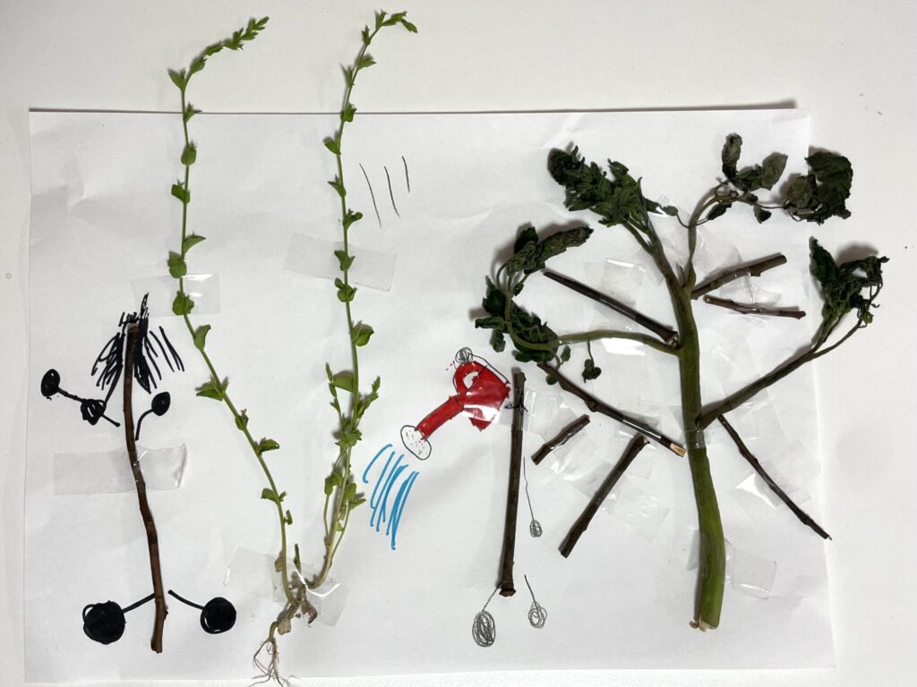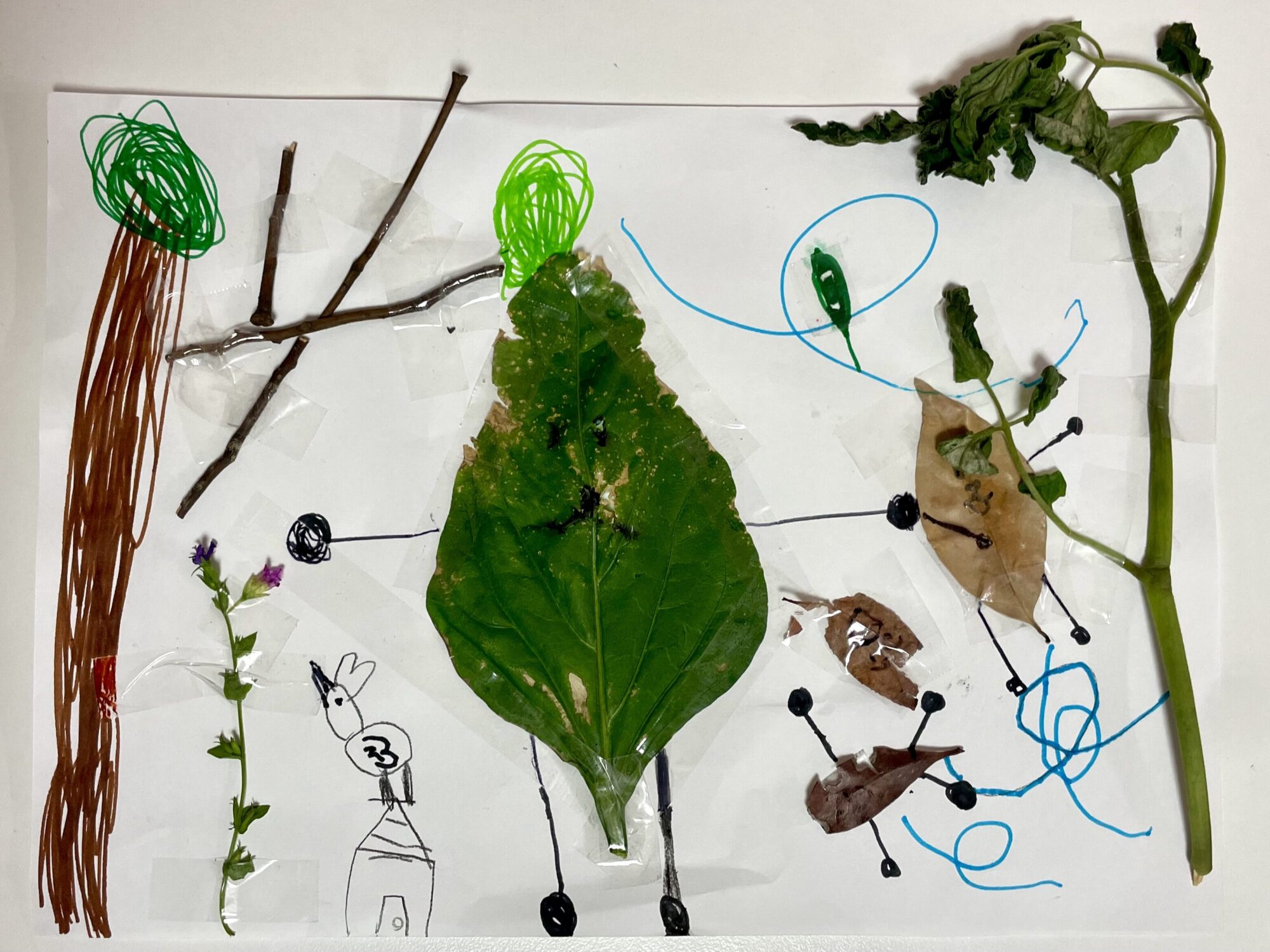 はっぱやぼうを見つけてはりつけたりかいたりして遊ぶのってたのしいよね〜🌱🍃