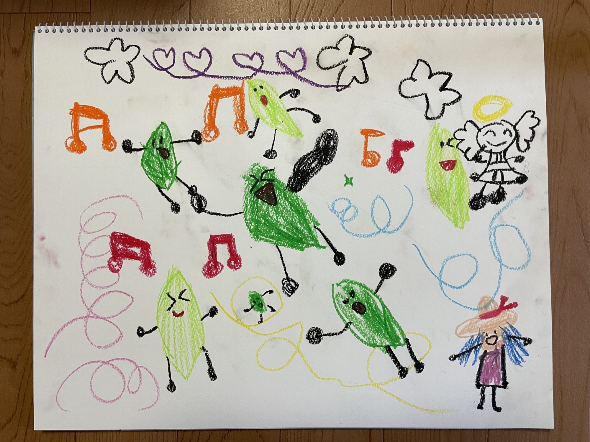 ひい~~~!!かわいい!!はるのもきるのもたのしかったことがよくつたわるさくひんですね!!はっぱさんやえのなかのいきものたちがうたったりおどったりしているようで、たのしいわらいごえがきこえてくるようなさくひんですね!!かぜがぴゅー~~っとふいて、さきちゃんの作品を見て せんせいもとってもうれしくなっちゃいました!!はっぱがきになって、、せんせいもやってみたいな~~こんな作品つくり!紹介してくれてありがとう!!