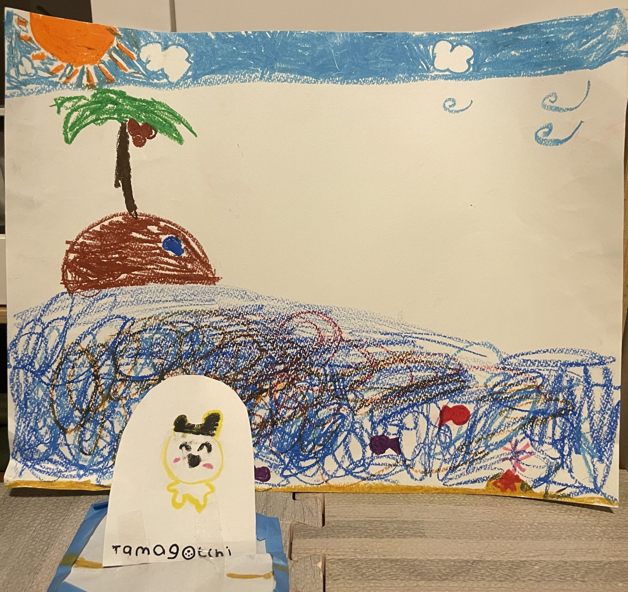 オレンジ色の太陽とヤシの木🌞🌴、ここはあつーい夏の島なのかな?でも描いてくれた風のおかげで、さわやかで気持ちいい感じも伝わってきます!