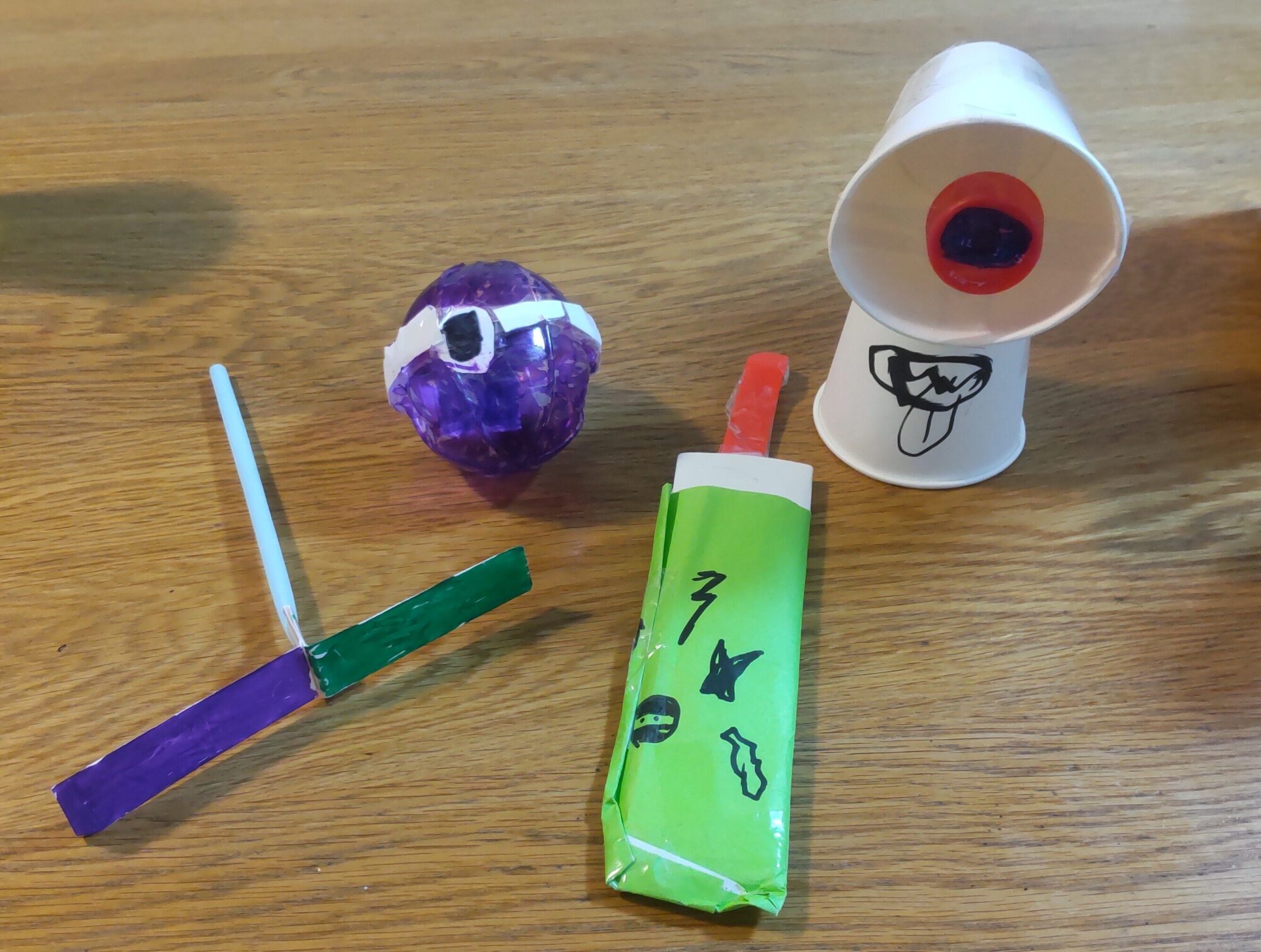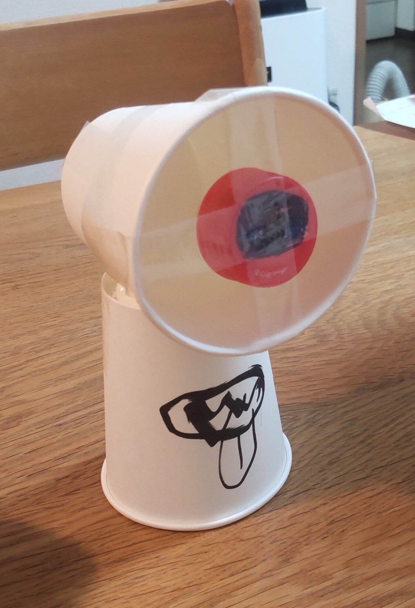 紙コップおばけと、竹トンボと、テラスタルオーブとレーザー銃を作りました(^^)