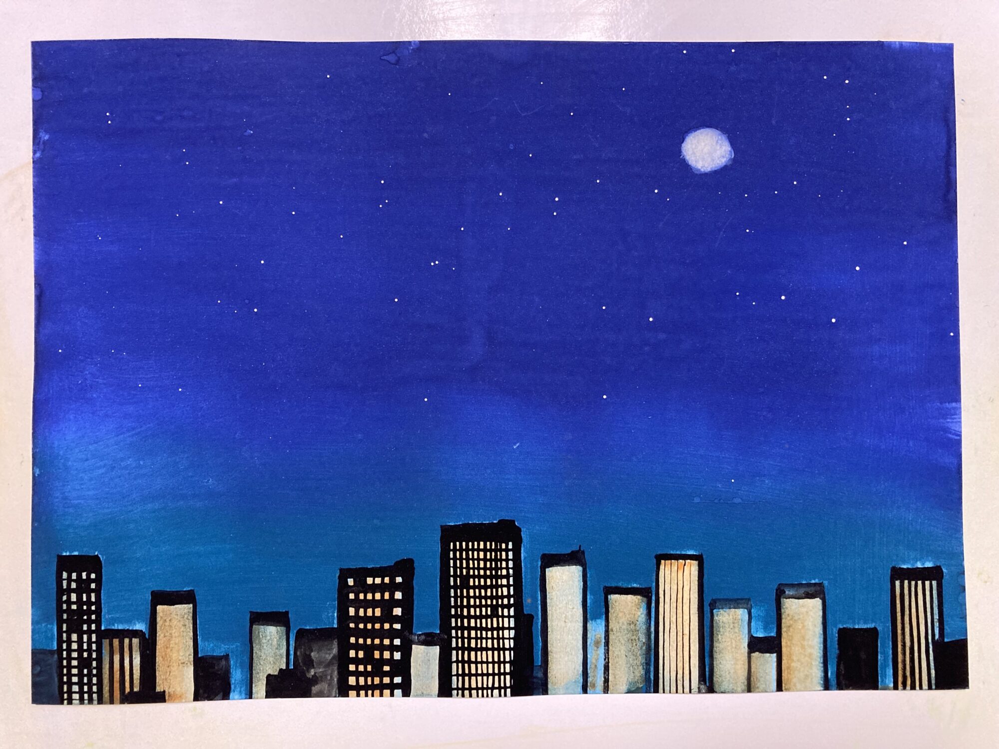 溝引きを使って、夜のビルを描きました。夜空は、下をちょっと明るくして、ひんやりとした静かなイメージにしました。ビルは、オレンジと青が若干混ざった感じで、少し暖かい感じにしました。また、空の絵の具を抜いて月を描いたり、親指と人差し指に絵の具をつけて、弾くようにして星を描いたりしました。