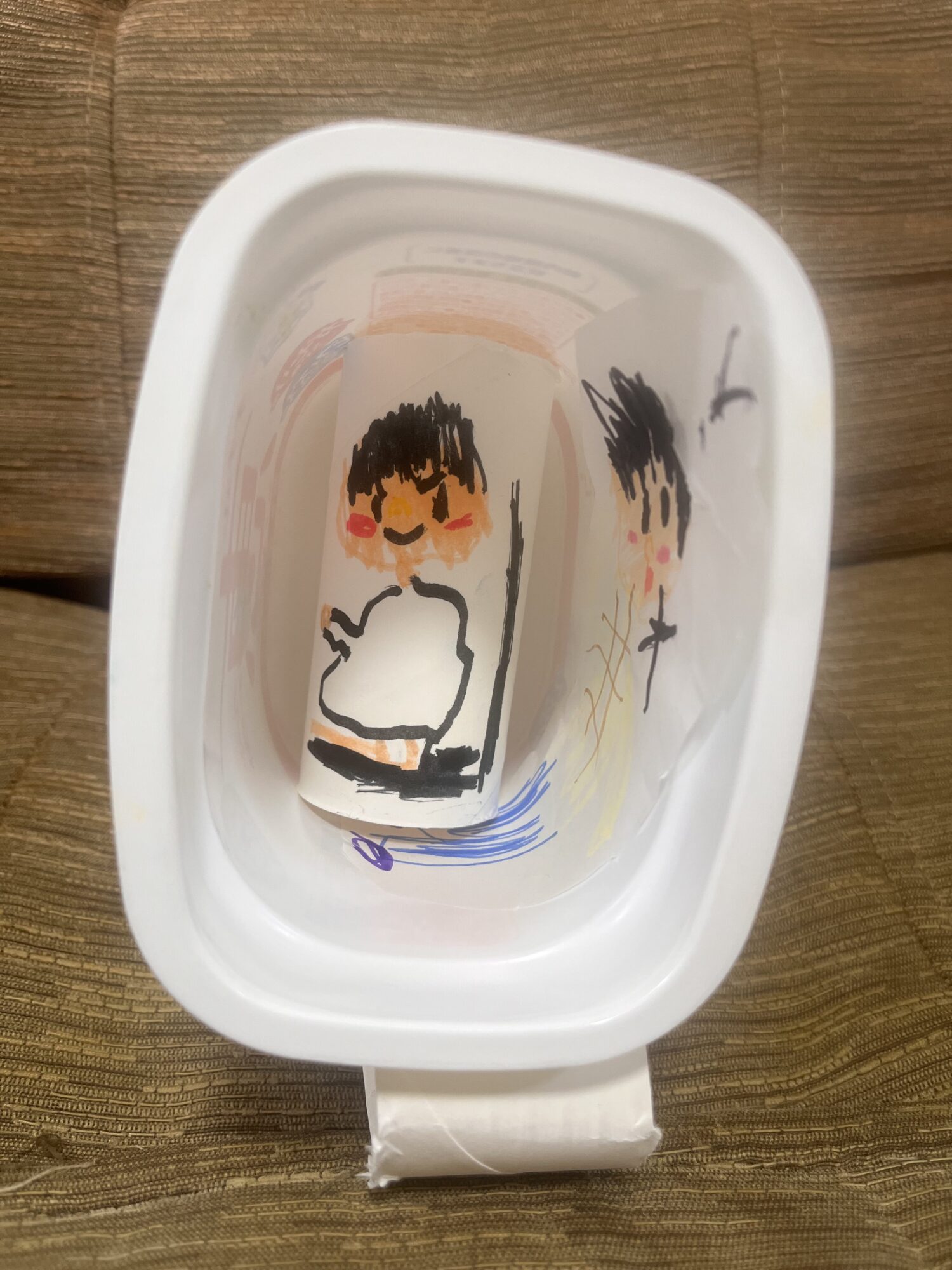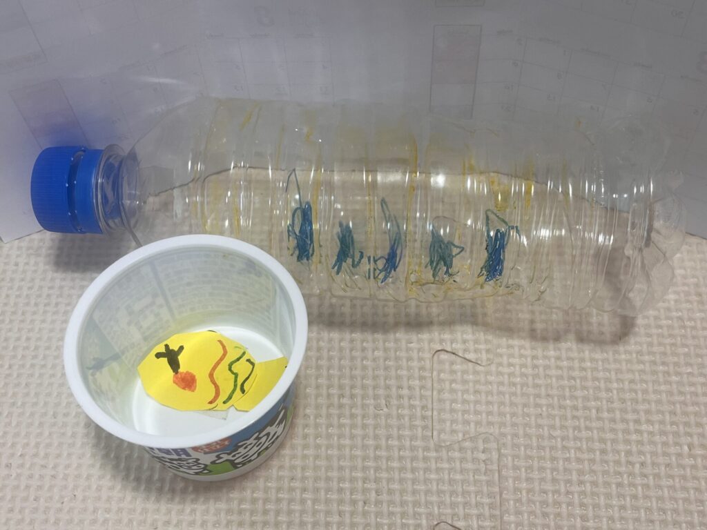 ペットボトルでせんすいかんも作りました。おともだちのおなかな「らめちゃん」も一緒です🐟