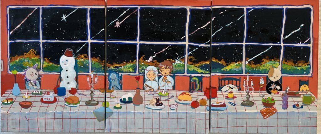 サイズ:F6(410×318)3 枚 制作時間:20 時間 キャンバスにアクリル 最後の晩餐のリメイク作品。生きる事と、食事はどの生き物でも深い所で繋がっている。 誰も裏切る事はなかったけれど、いつか終わってしまうなら、いつか全ての生き物が仲良く暮らせることを願っている。 ちきゅうが終わるその日まで