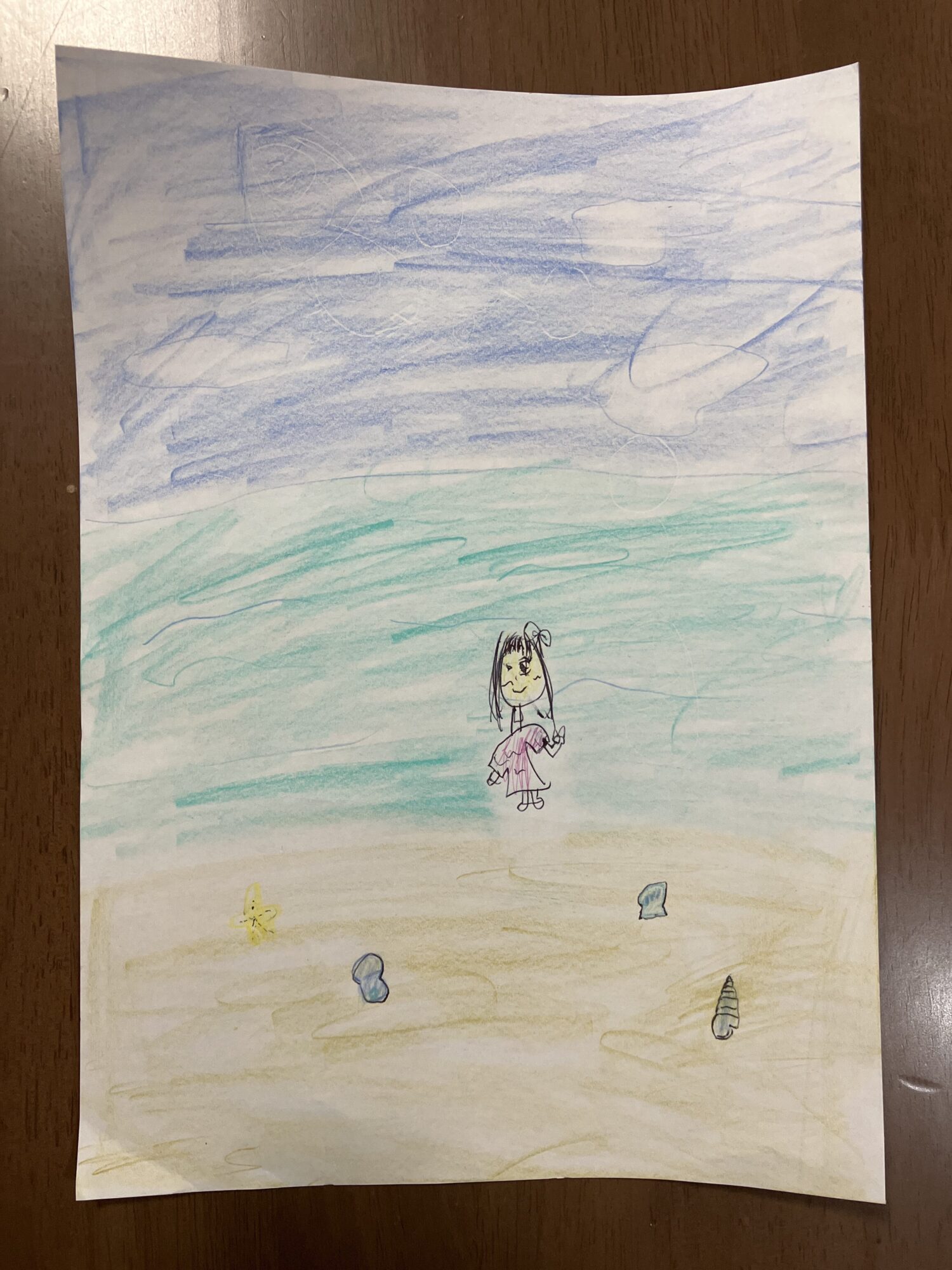 女の子もオシャレで可愛いです!表情がニコニコしていて可愛いですね😉砂浜に貝の絵もあるのが良いですね!🐚