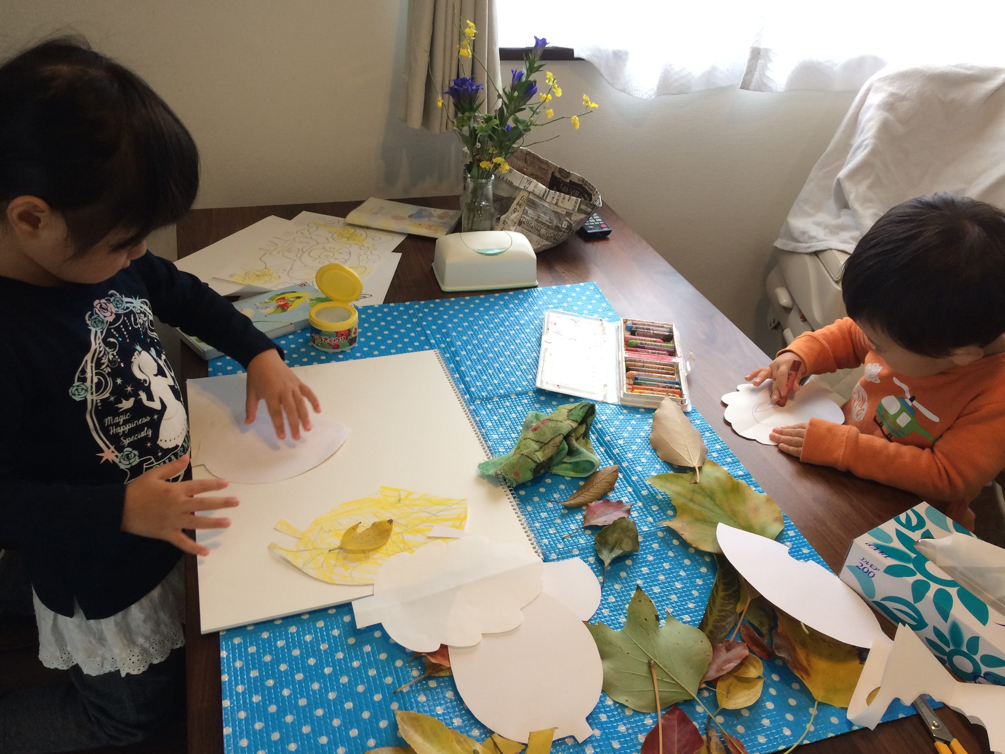 お母様も、本物の葉っぱを見ながらお絵描きする機会を与えてくださり、ありがとうございます。おとうとくんもいっしょでなんだかすごく楽しそう!