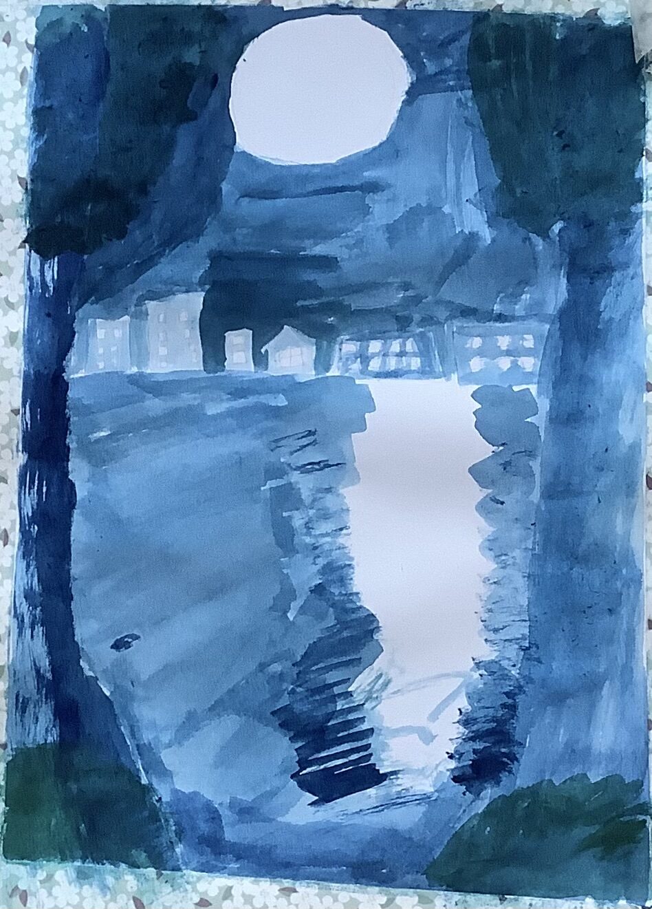 手前側には大きい木🌲向こう側には街🌇を描きました。紙は月を主役にしたかったので、縦にしました。家の窓には塗り残す術を使いました。葉っぱは藍色に少し黄緑を足して塗りました。アドバイスなどアドバイスなどのコメントお願いします🙇また見に来てください♪