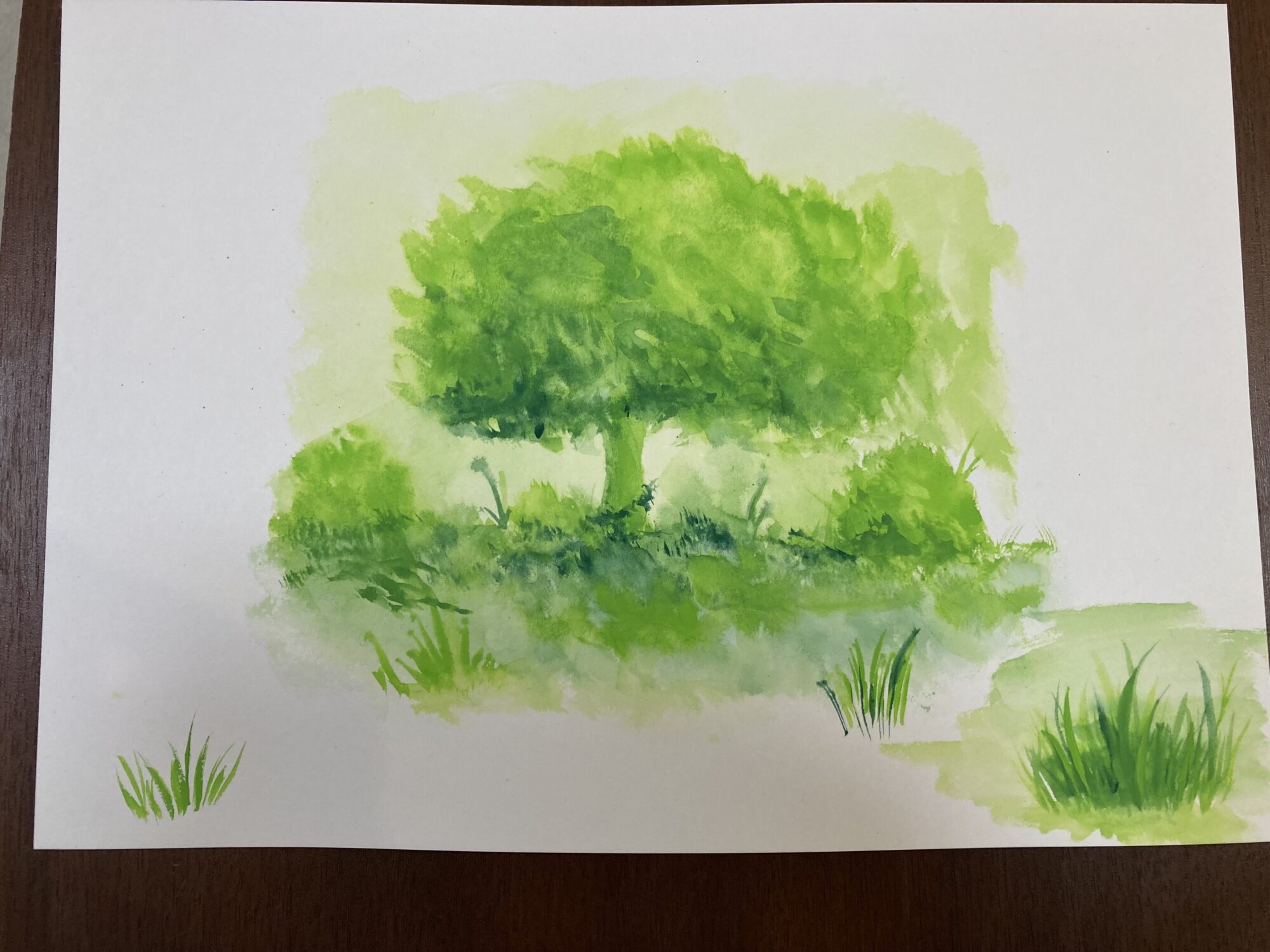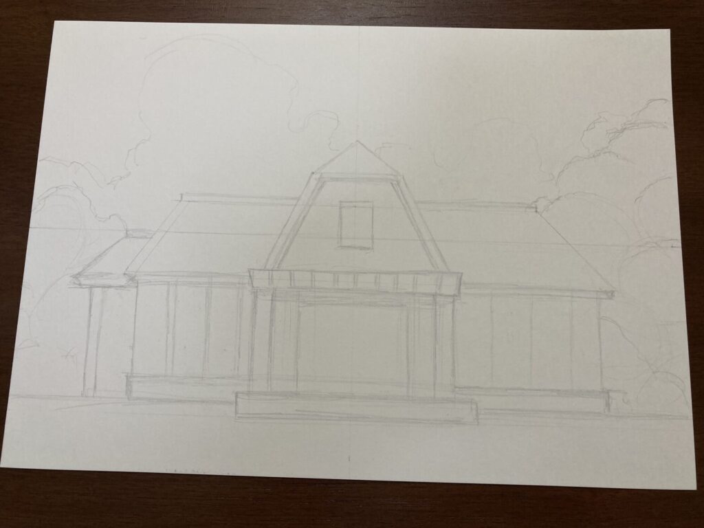 1枚目は、光の中にある一本の木と周りの草などを描きました。色の濃淡で、神秘的な感じを表現しました。2枚目は、さつきとメイの家の風景の下書きをしました。定規で引いた線と、フリーハンドで引いた線で、描きました。楽しかったです!