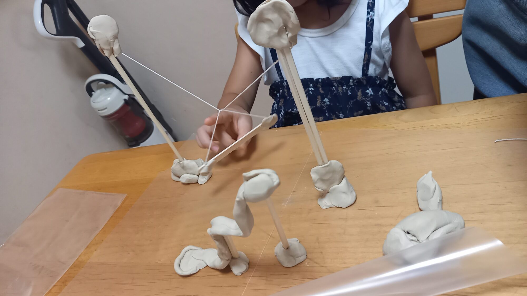 うまく割り箸が立ち上がらずイライラしたり泣きそうになったりしつつも最後まで頑張り、満足の行くものが作れたようです。