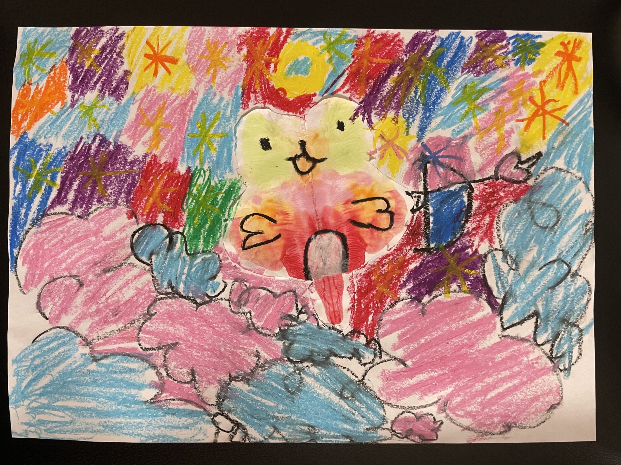 つねお先生 先生2024年9月20日 9:04 AM 偶然できた絵の具の広がりの形を可愛らしい妖精さんに見立てた発想力、ひらめき力素敵です! また、周りに色鮮やかなクレヨンの色たちが心をワクワクさせてくれます! 楽しかった気持ちが絵からも伝わってきます!!! ログインして返信する ↓