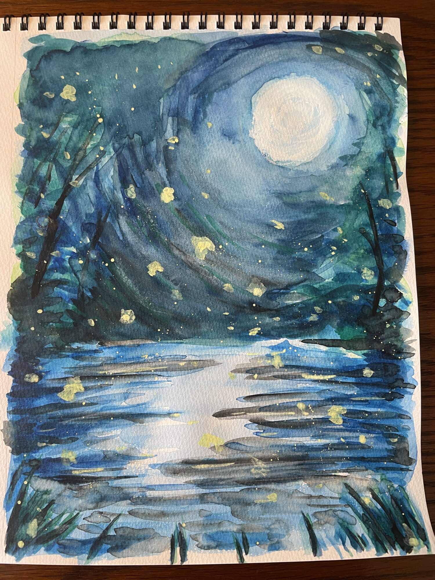 スア アートフレンズ2024年9月26日 1:38 PM 闇に溶けている光の表現がよくできていると思います!光っているところは、明るい青を 暗い闇のところは青と緑色のが混ざっていて、絵に空間感を出していると思います! 周りの黄色は、蛍の光のようで、蛍の鳴き声が聴こえそうです〜 ログインして返信する ↓