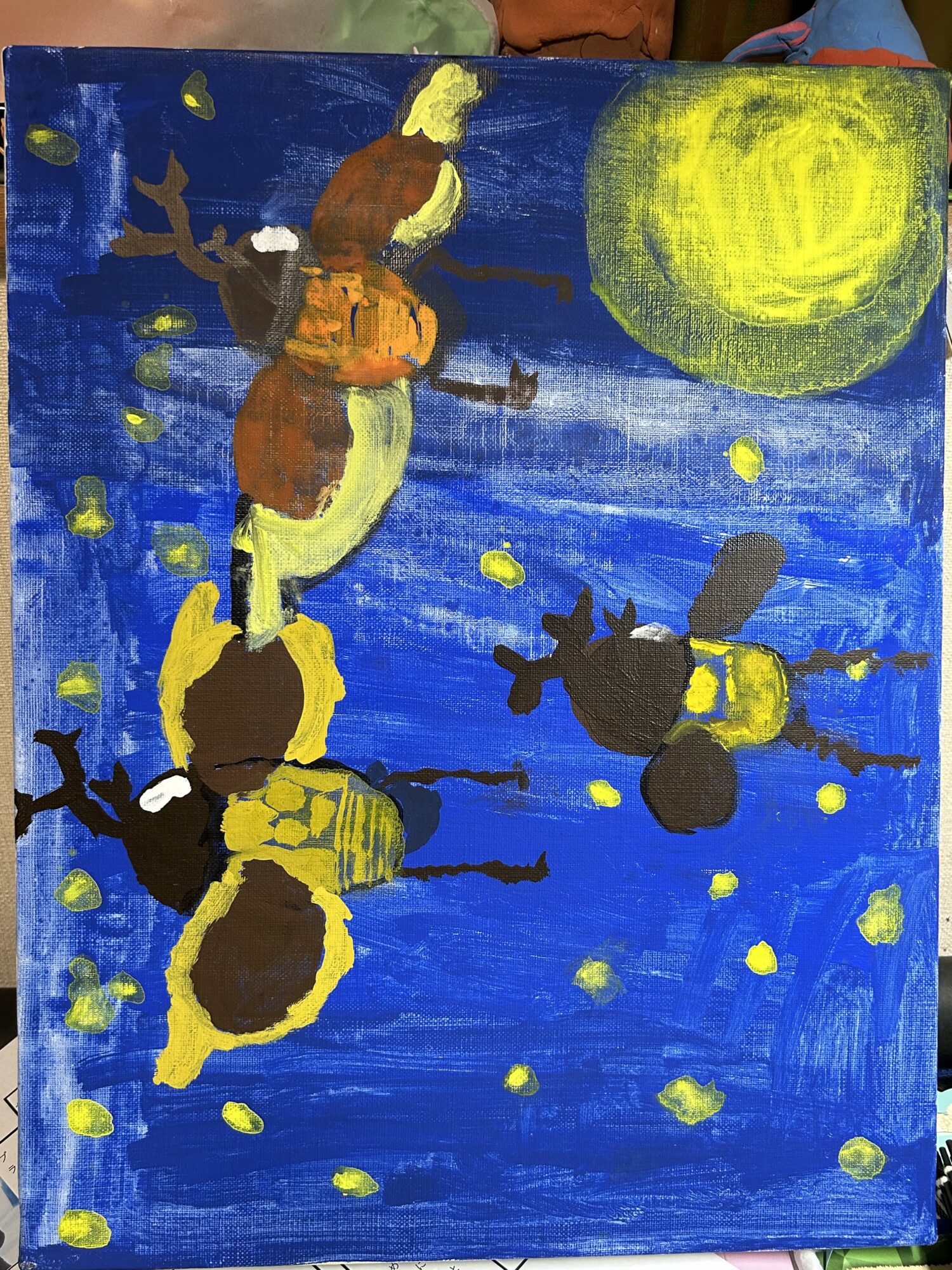 黄色の丸は、夜空の星のようにも見えるし、蛍の光のようにも見えてとても素敵だと思います。〜