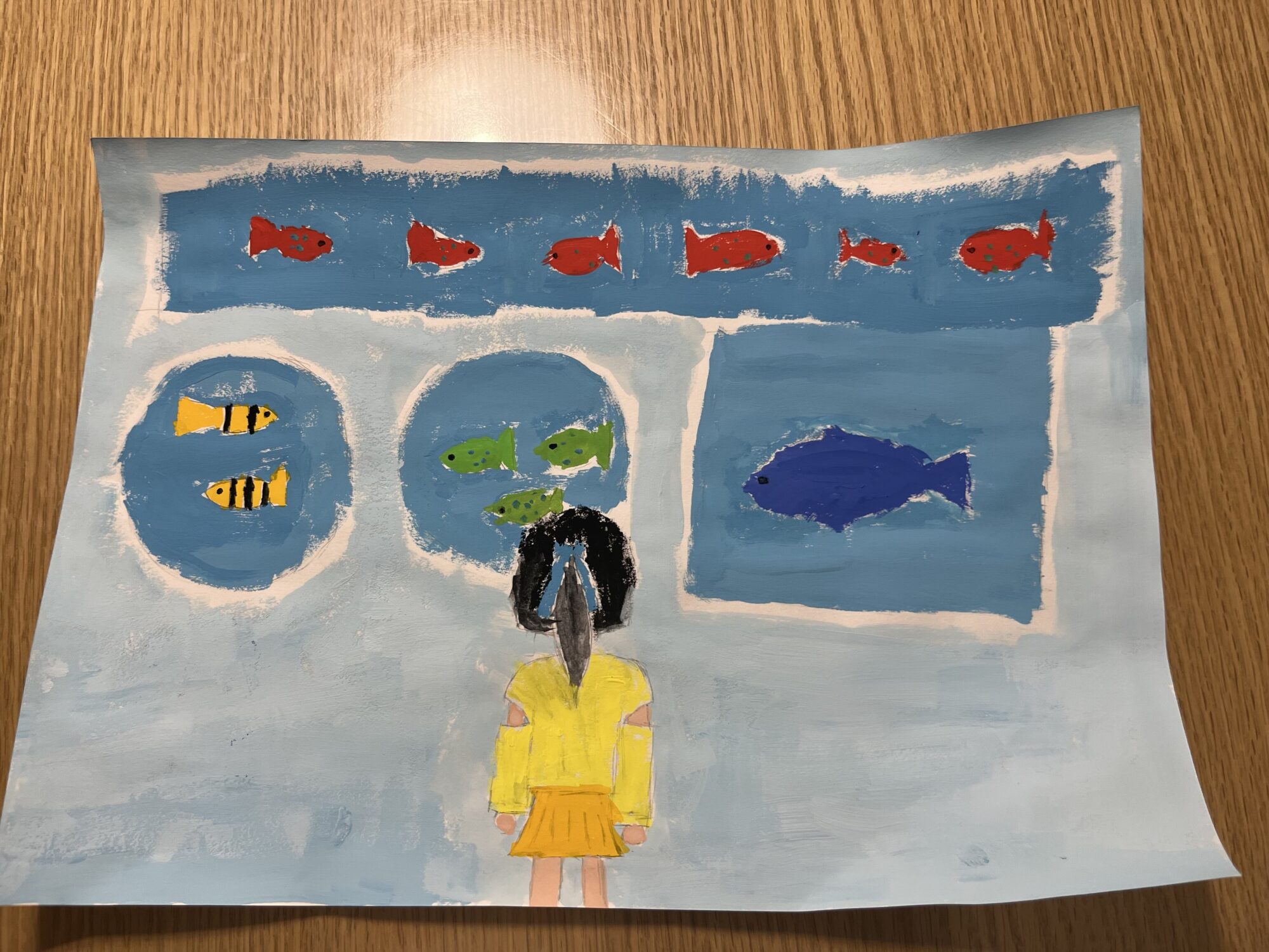 海と違い、お魚さんたちにとっての水槽はまるで学校のような場なのかも・・とこの絵を見て思いました。