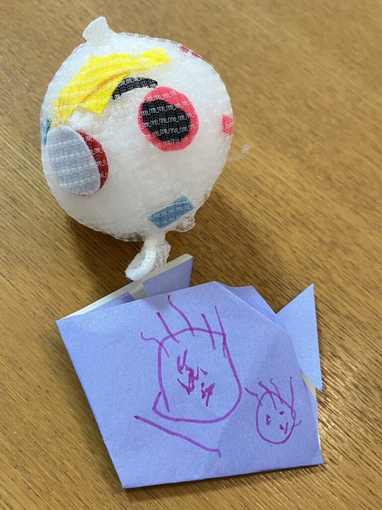 丁寧にシールを剥がしたり、頭にハチマキのようにシールを貼ったりして工作しました。折り紙でネコちゃんのお友達を作ってあげて遊びました。