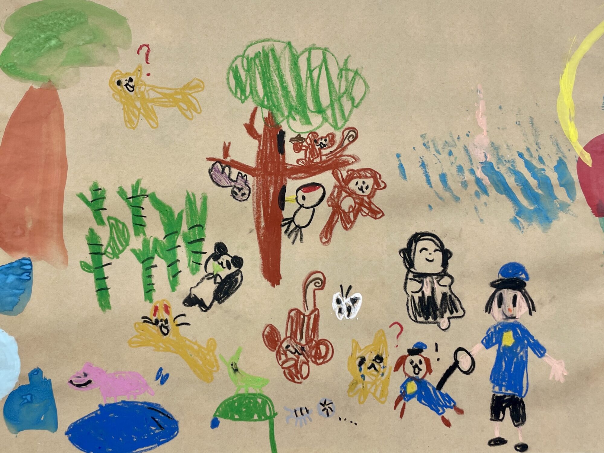森の中で暮らすどうぶつたち、まいごの迷子のこねこちゃんと、探している犬のおまわりさんを描きました。